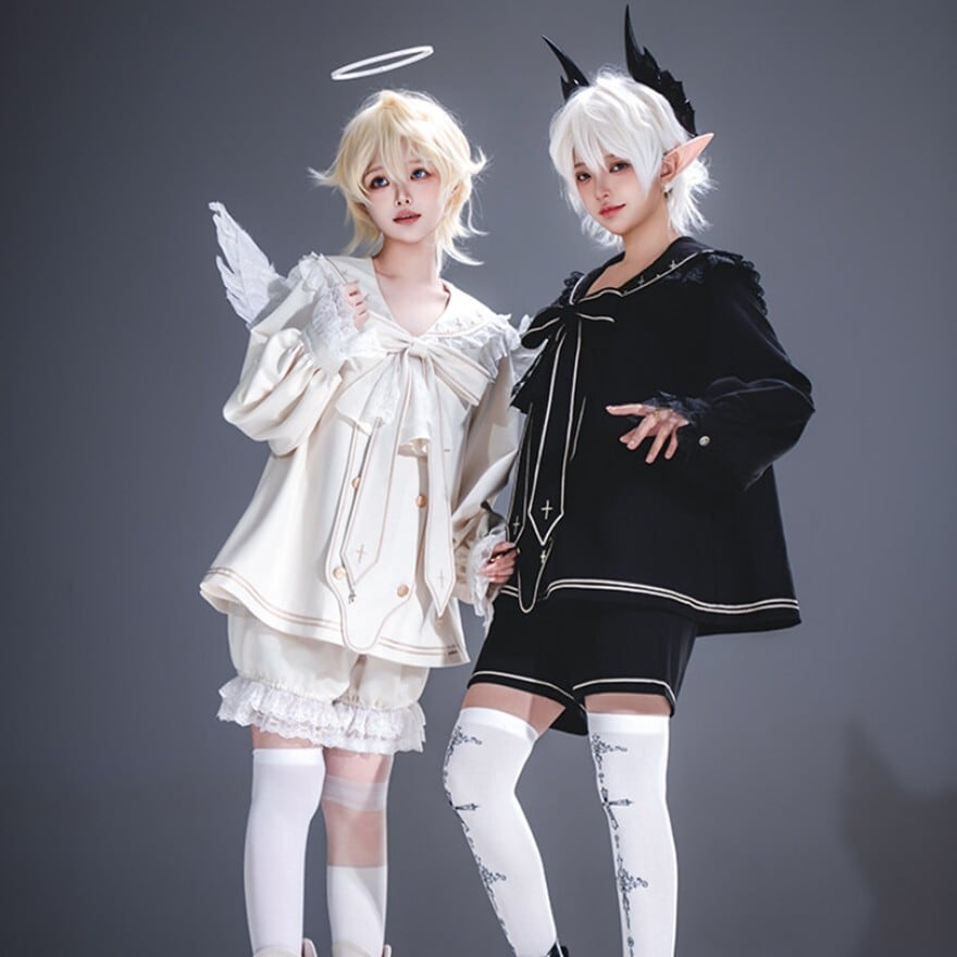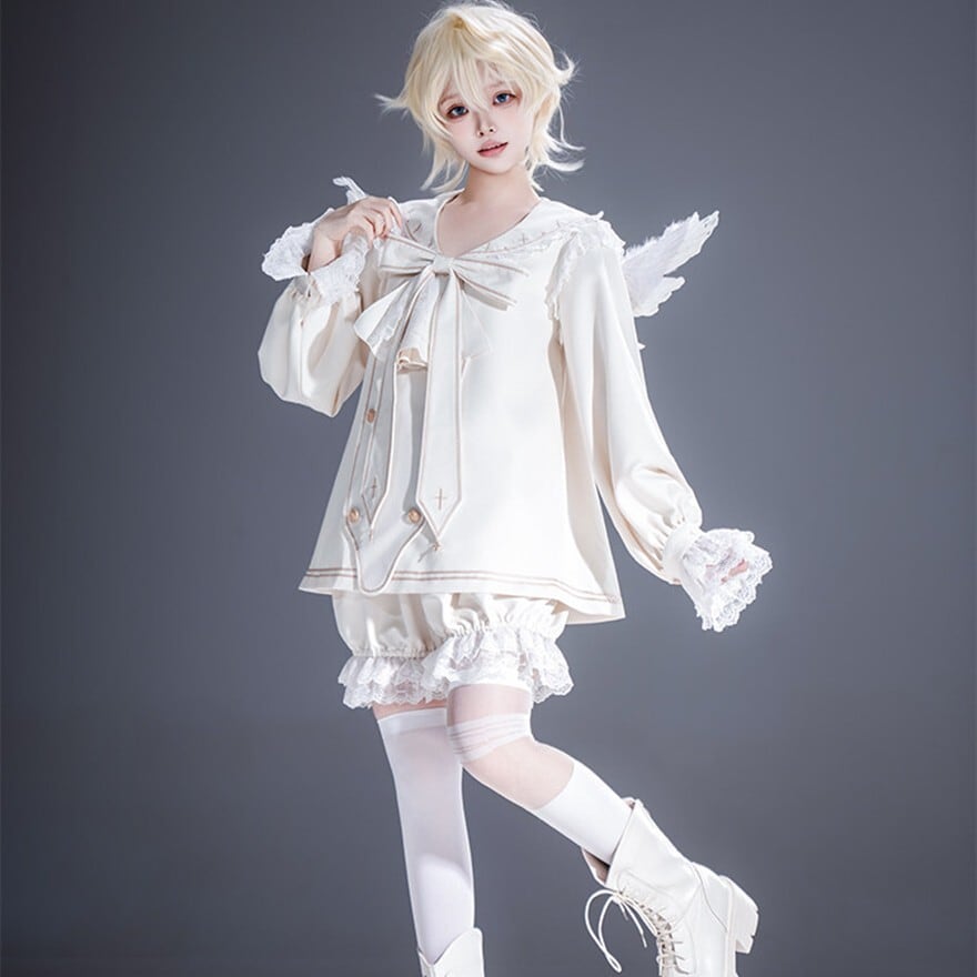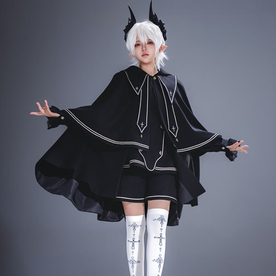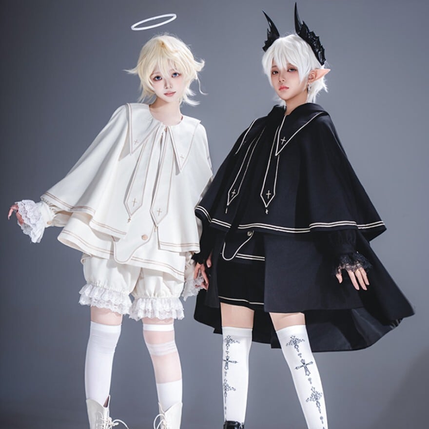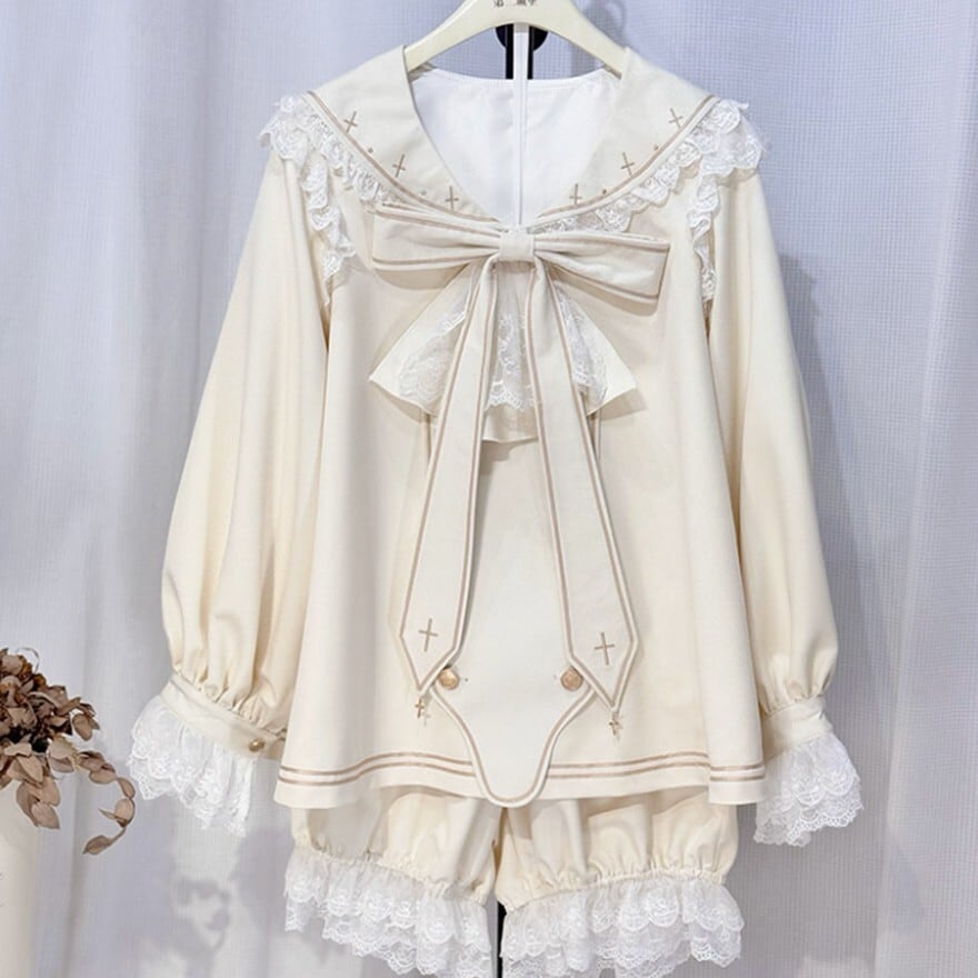 ブラックまたはホワイトの生地に、繊細なレースと十字モチーフが施された、クラシカルロリータの上衣+ズボン+ネッカチーフ+リボンの4点セットです。