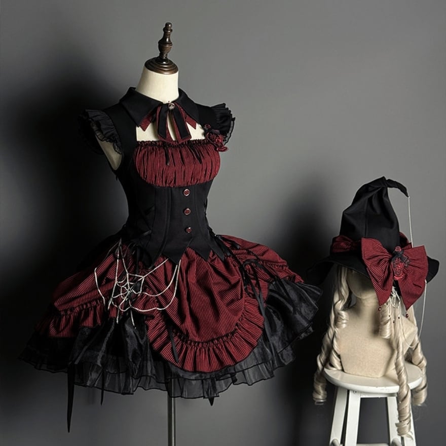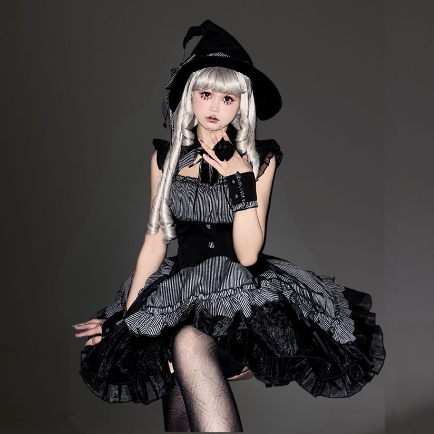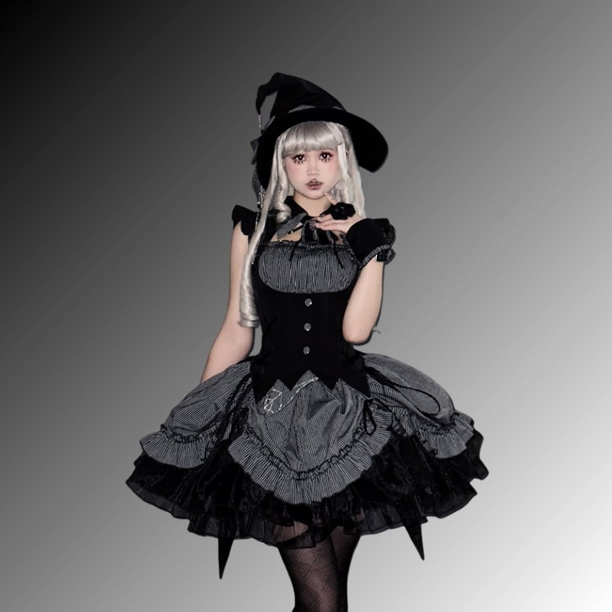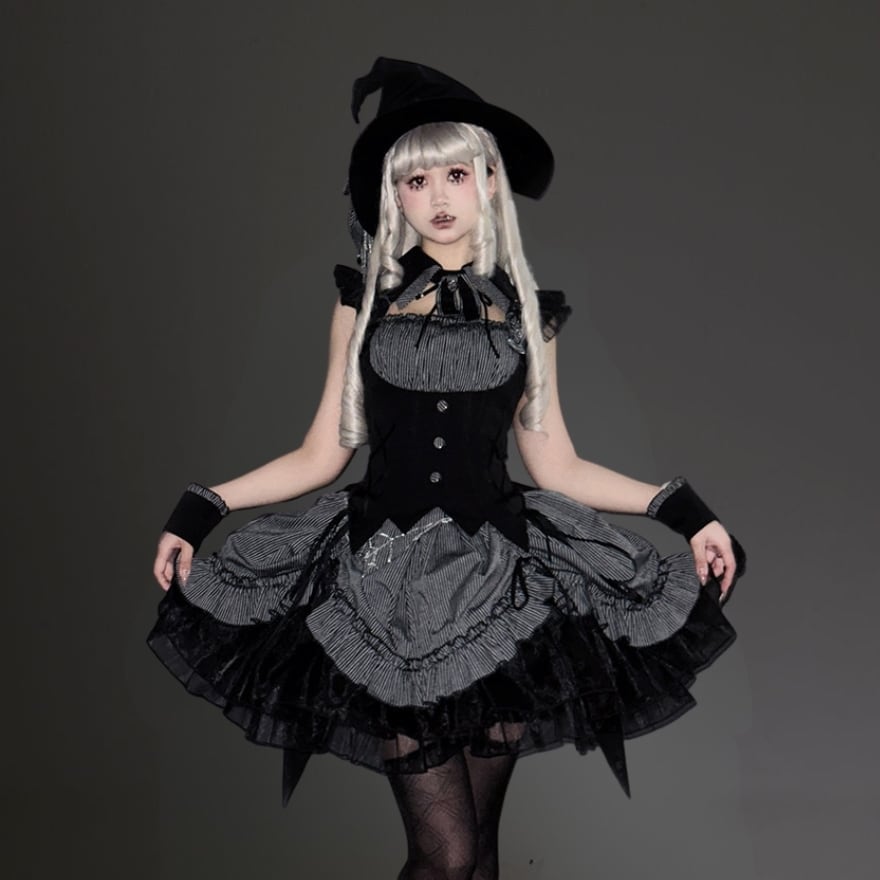 コルセット風切替とフリルスカートで細見えを叶え、ハロウィンやイベント撮影に映える一着です。