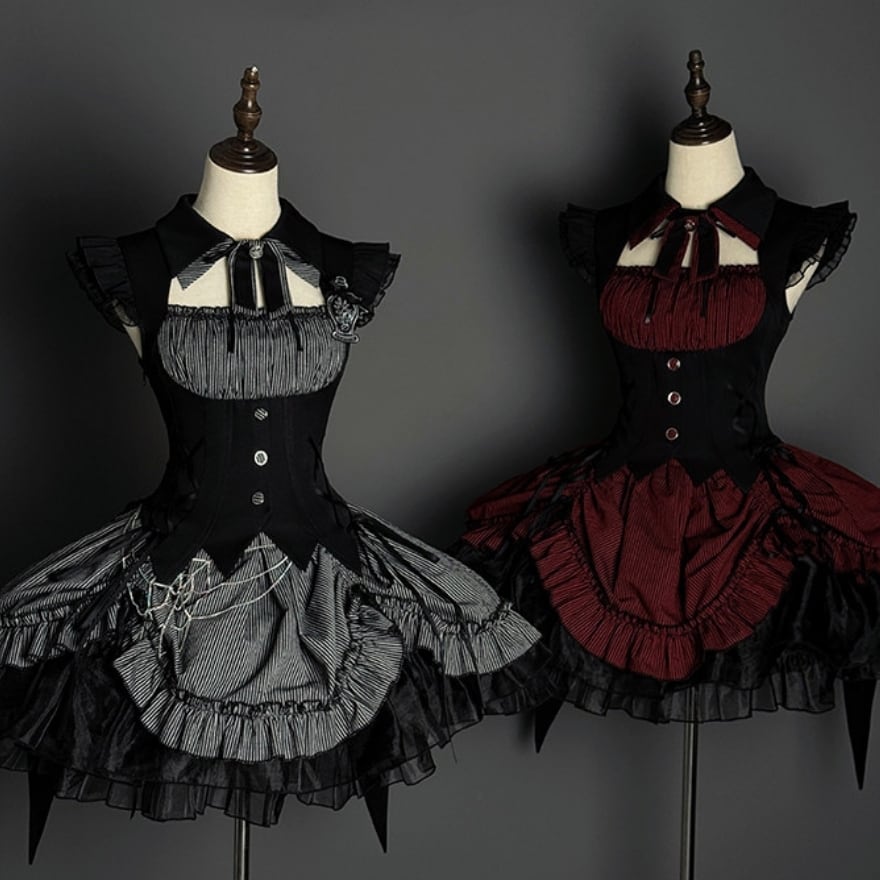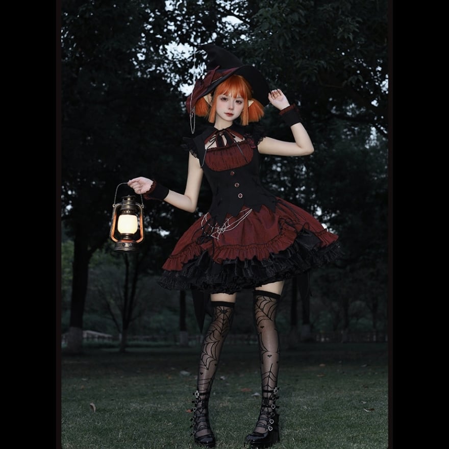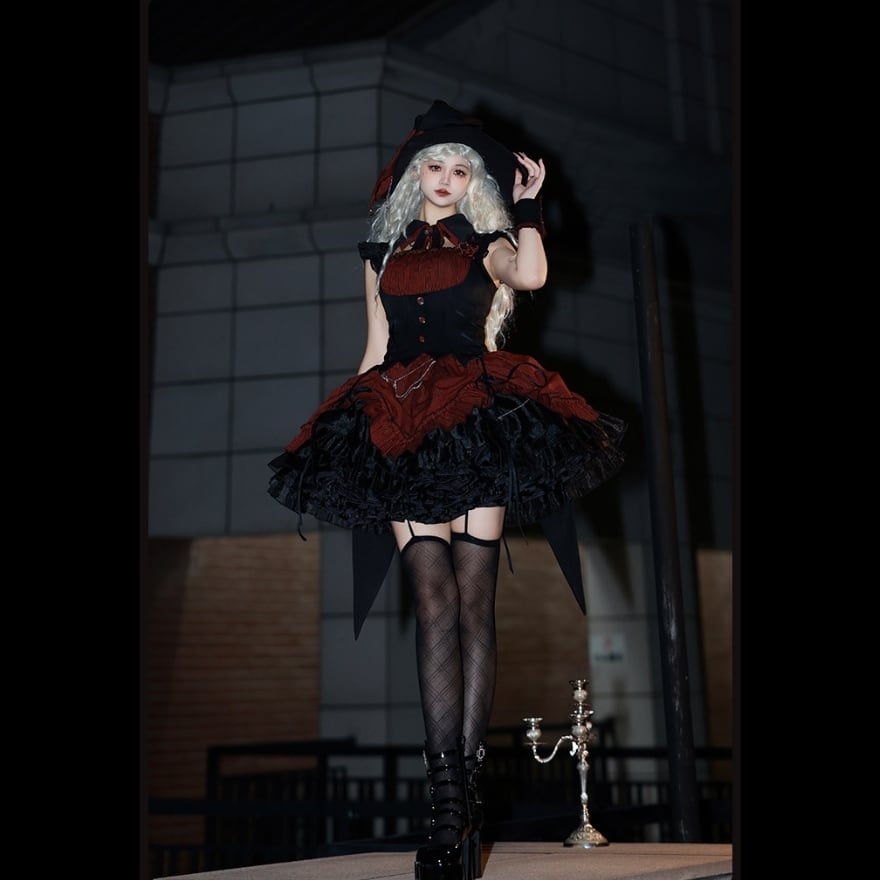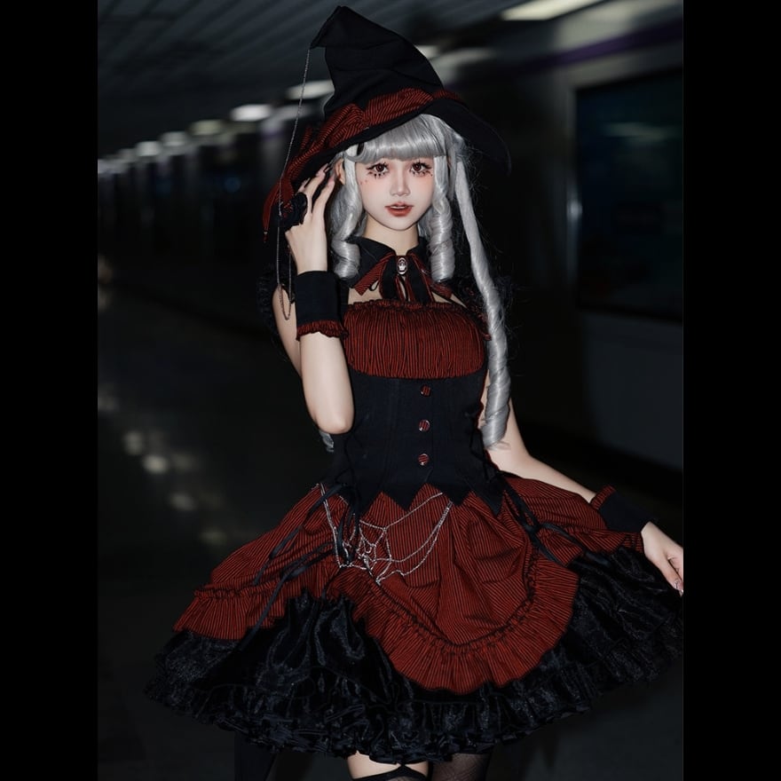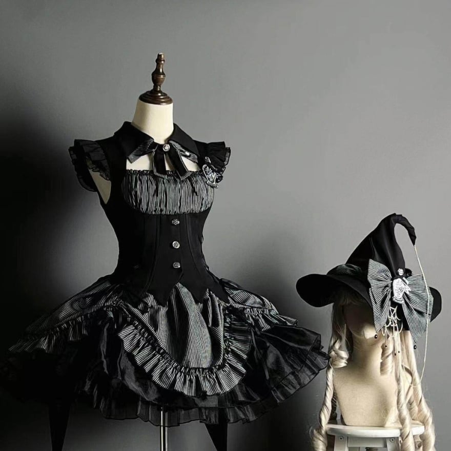 コルセット風切替とフリルスカートで細見えを叶え、ハロウィンやイベント撮影に映える一着です。