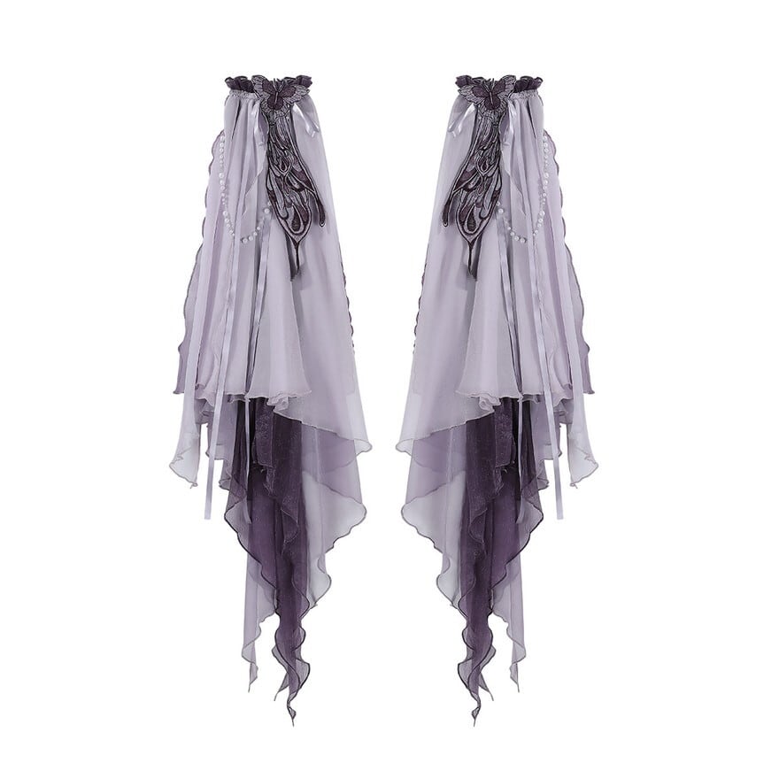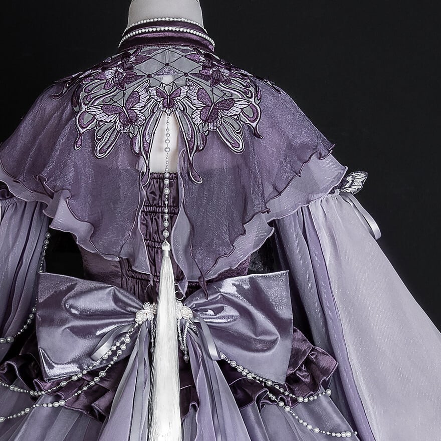 幻想的な紫を基調に、蝶モチーフの刺繍と揺れる装飾を重ねた