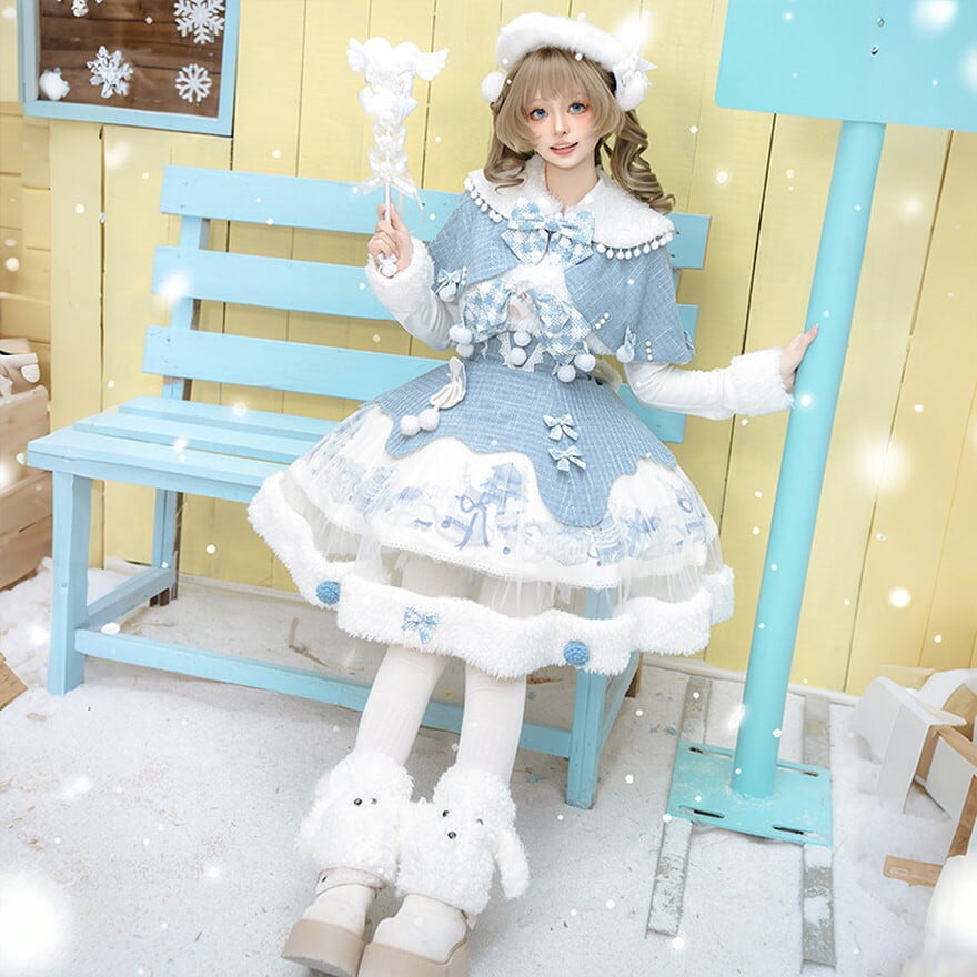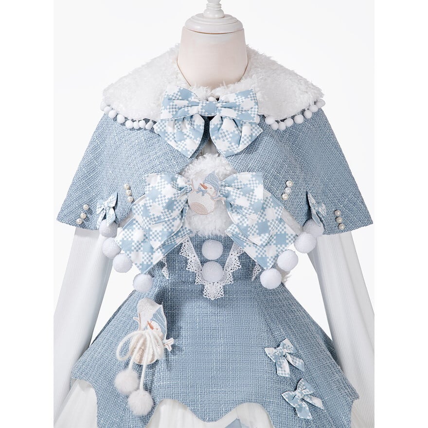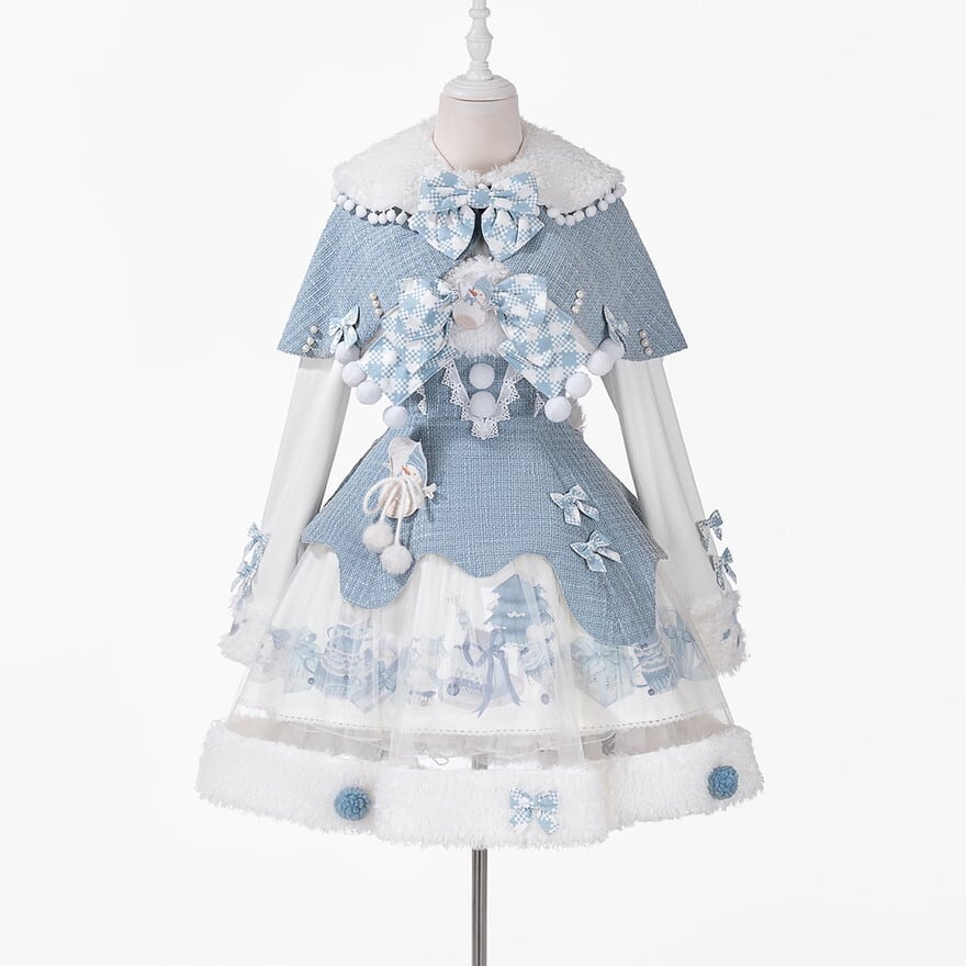 冬に映える 甘ロリセットアップ ふわもこ ケープ付き ガーリー ブルー JSK