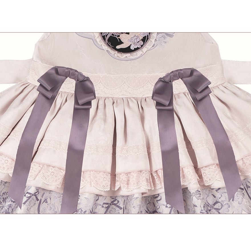 幾重にも重なったティアードスカートと、肩口や裾の繊細なレースが、圧倒的なボリューム感と華やかさを演出します。