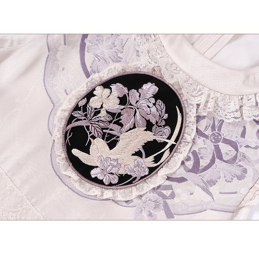 高級感のあるジャガード織りの生地を贅沢に使用し、胸元にはオリエンタルな雰囲気漂う花と小鳥の円形刺繍をあしらった中華風メイドドレスです。