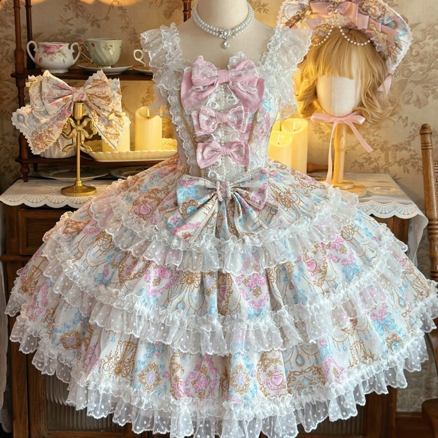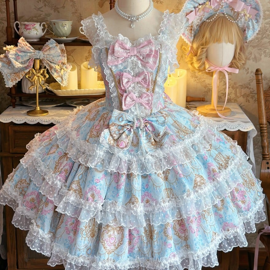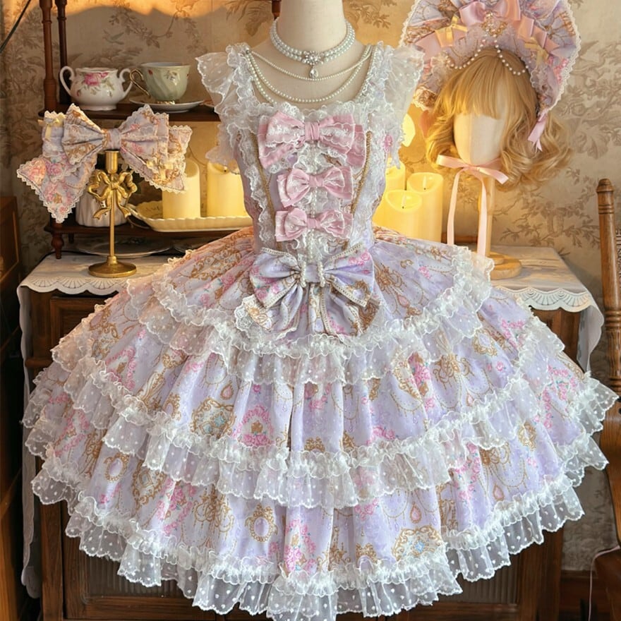お茶会やイベントで憧れのお姫様スタイルを叶えたい人に向けた、華やかな花柄プリントと多層フリルが魅力の甘ロリィタJSKです。