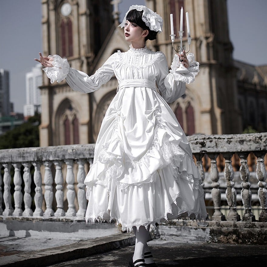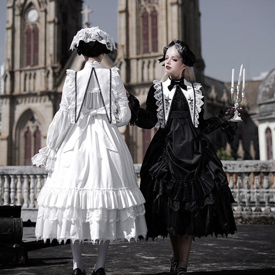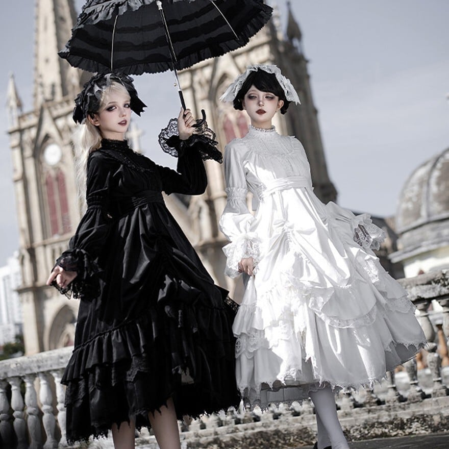 モノトーン配色と繊細なレース・フリルを組み合わせた、初心者でも安心して着られるクラシカルロリィタのOP5点セットです。