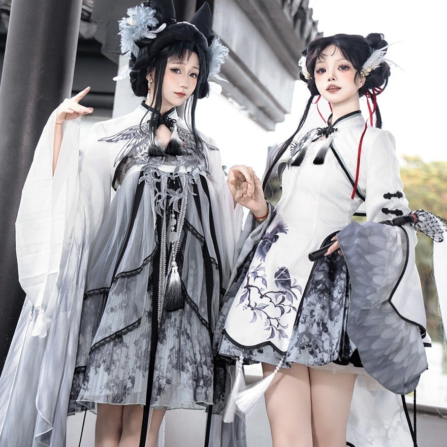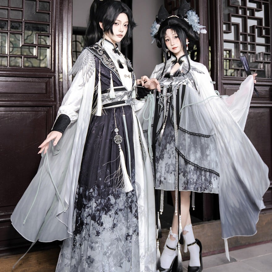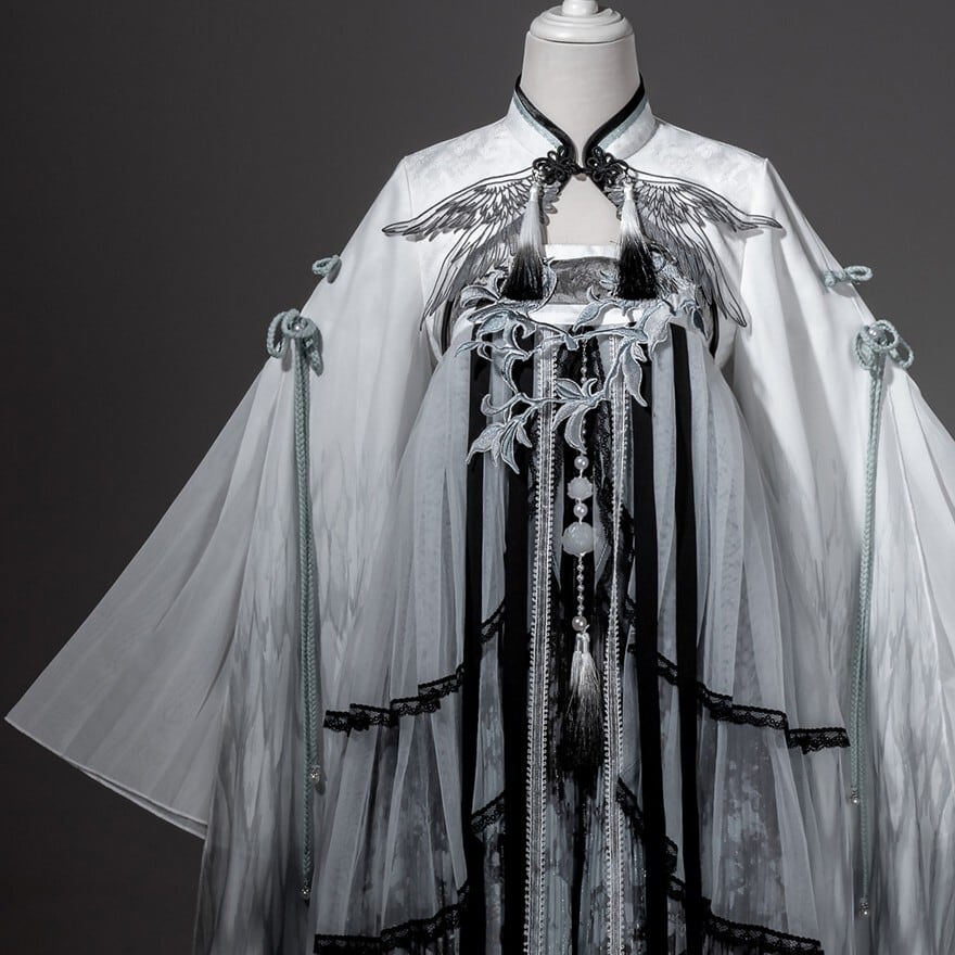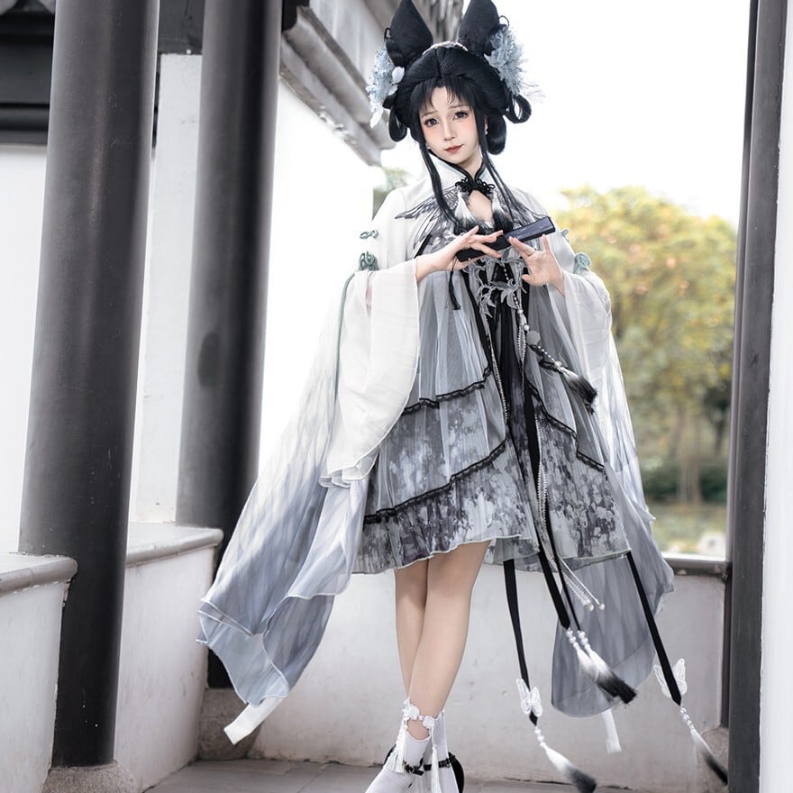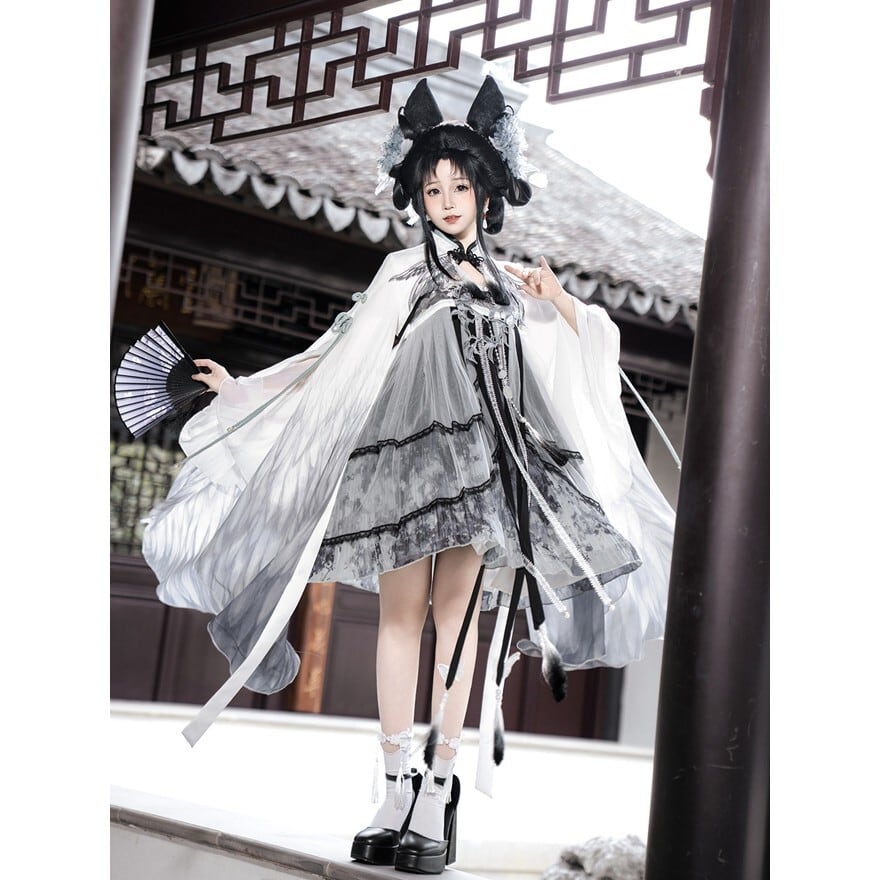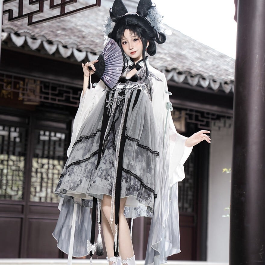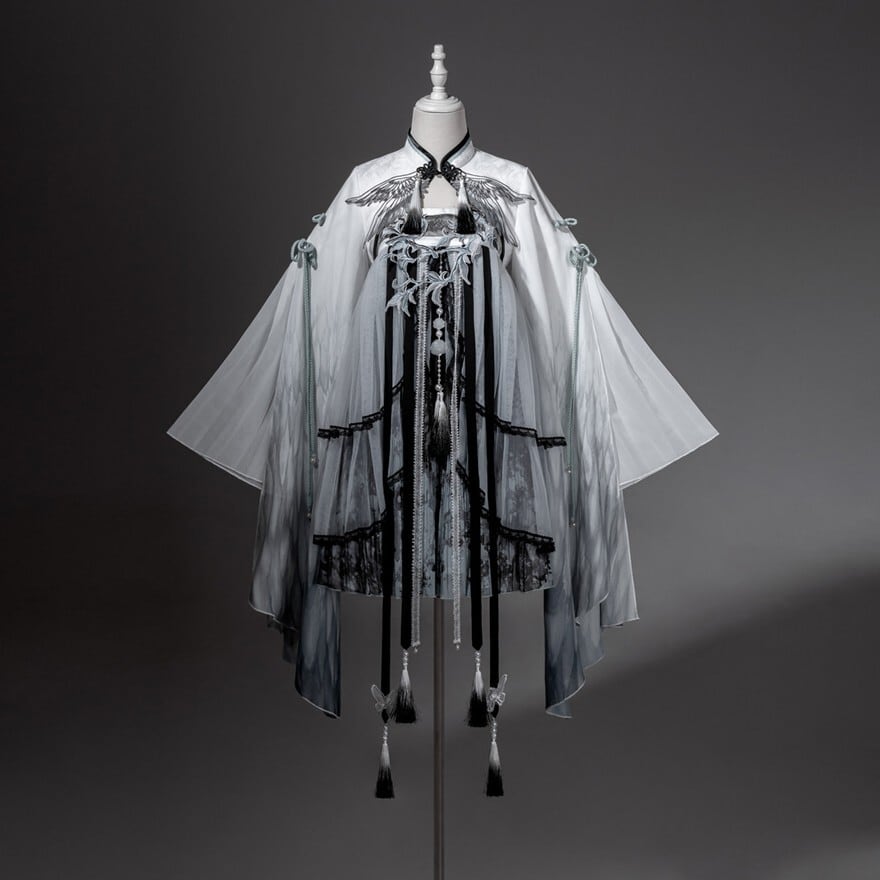 スモークグレーのグラデーションと透け感素材を組み合わせた、幻想的な世界観が魅力の「チャイナロリータ」ワンピースです。立ち襟のチャイナデザインに、天使翼刺繍とケープを重ねることで、舞台衣装や推し活でも映える印象的な一着に仕上げました。甘さを抑えた配色で、初心者の方や大人ロリータにも取り入れやすい設計です。