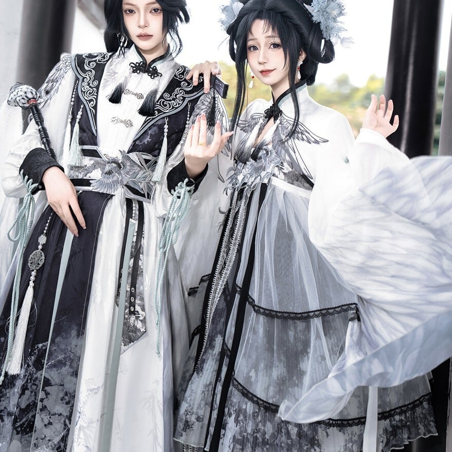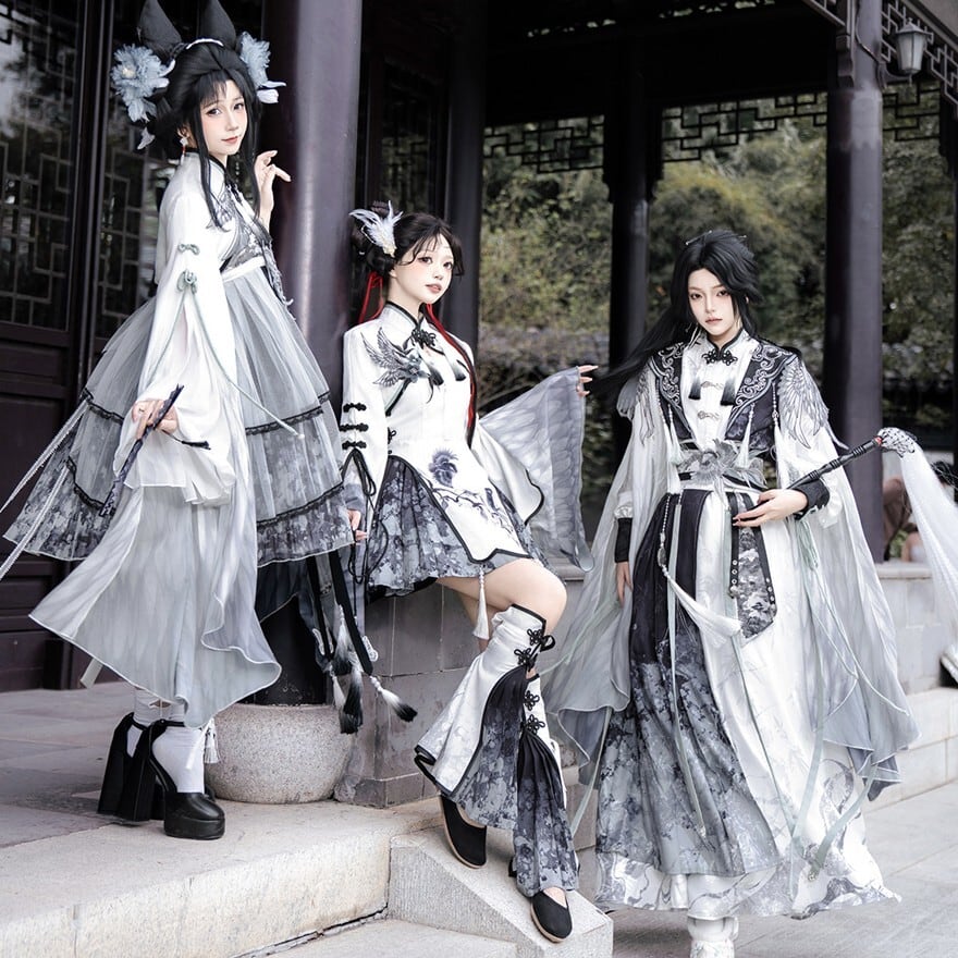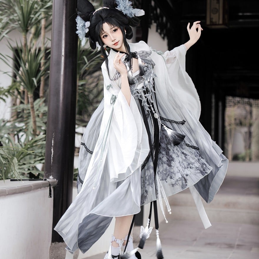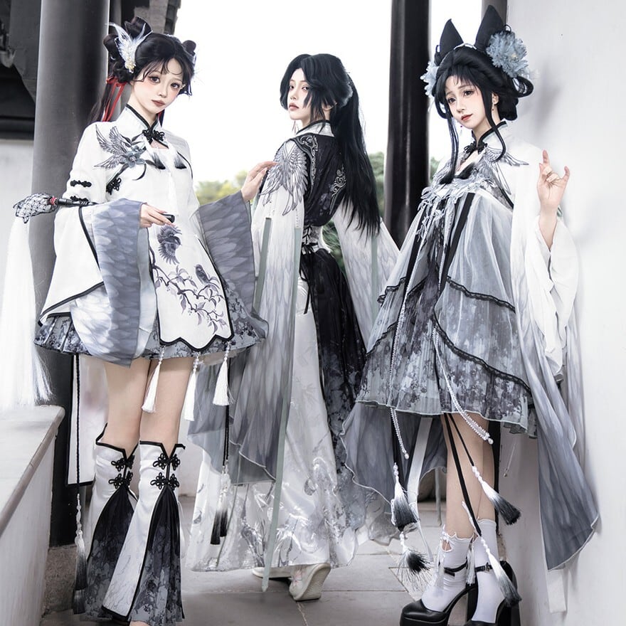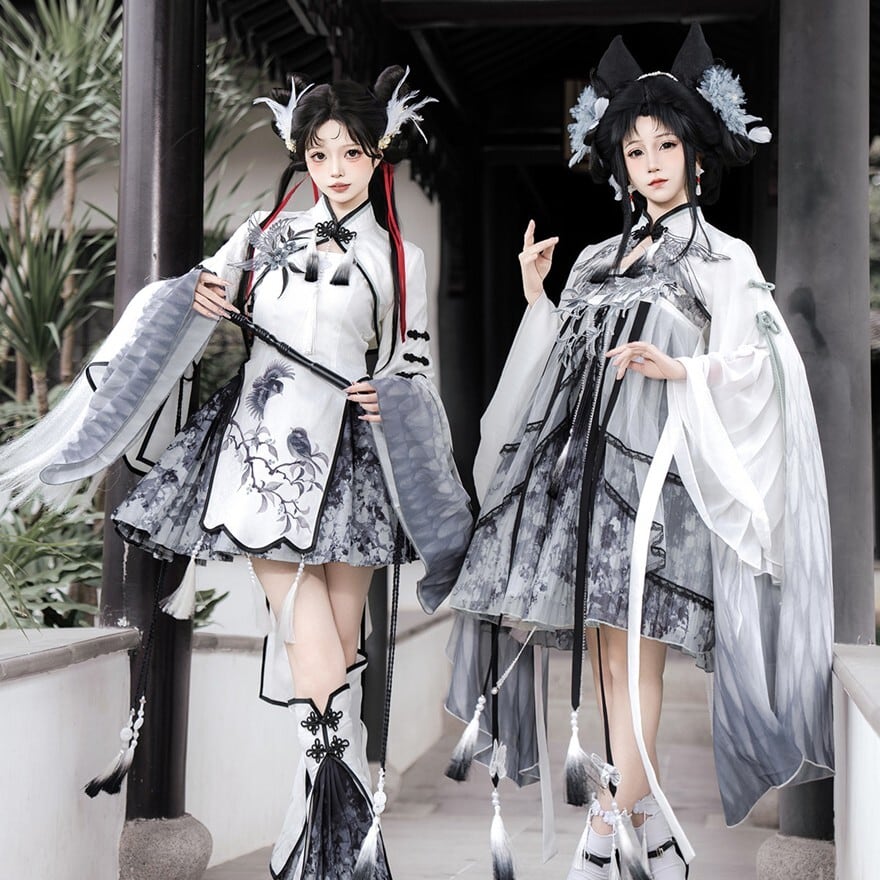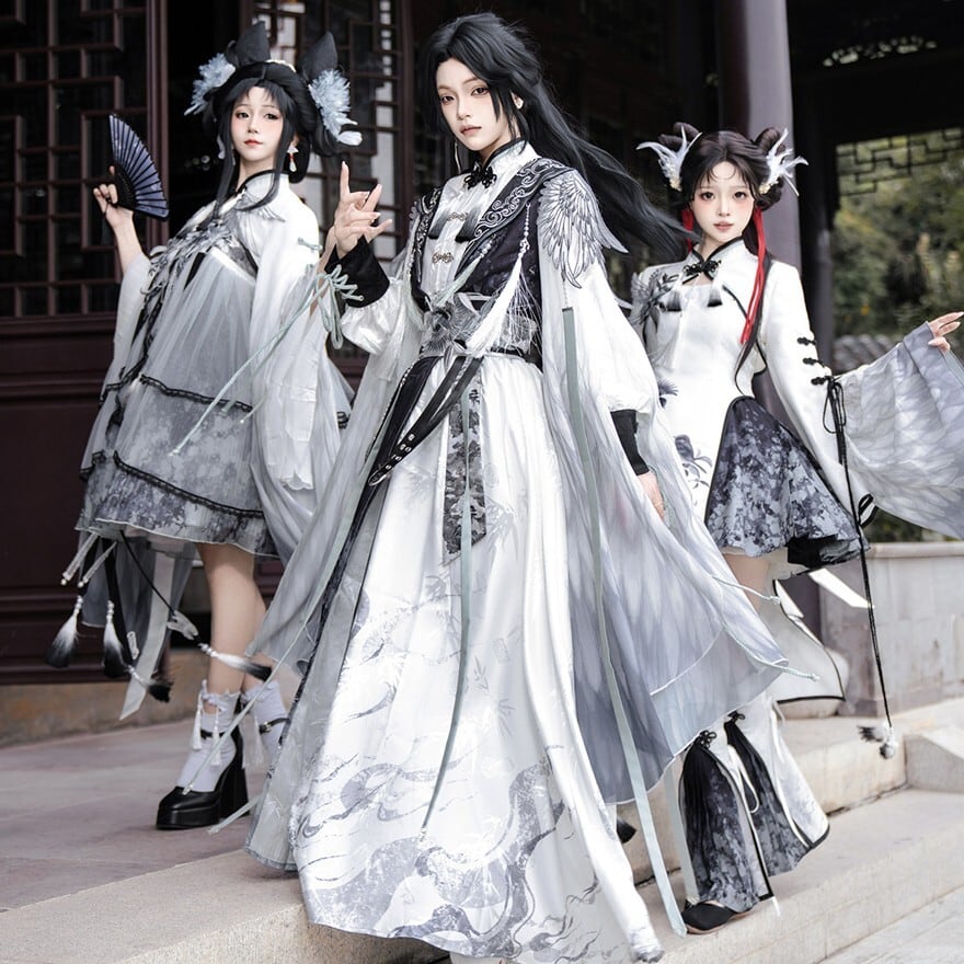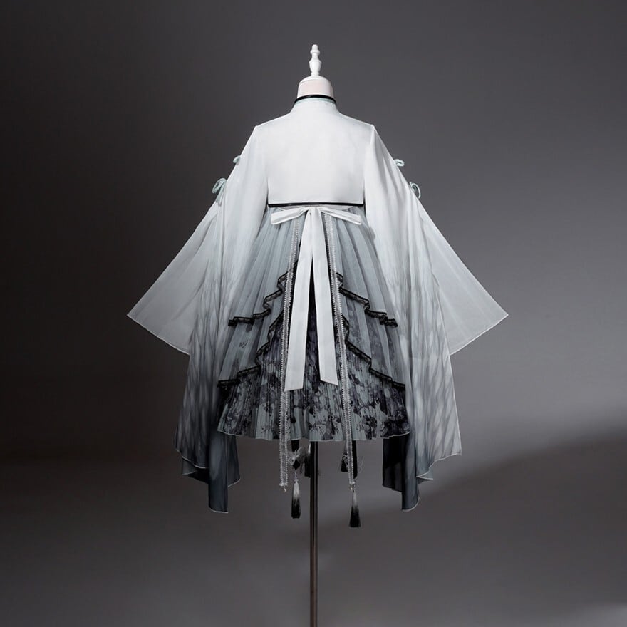 スモークグレーのグラデーションと透け感素材を組み合わせた、幻想的な世界観が魅力の「チャイナロリータ」ワンピースです。立ち襟のチャイナデザインに、天使翼刺繍とケープを重ねることで、舞台衣装や推し活でも映える印象的な一着に仕上げました。甘さを抑えた配色で、初心者の方や大人ロリータにも取り入れやすい設計です。