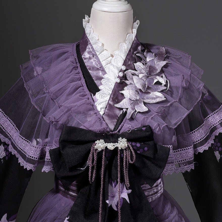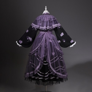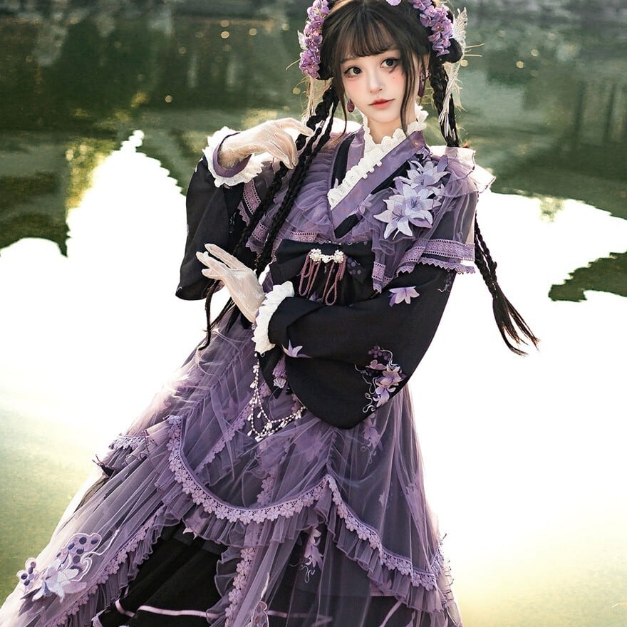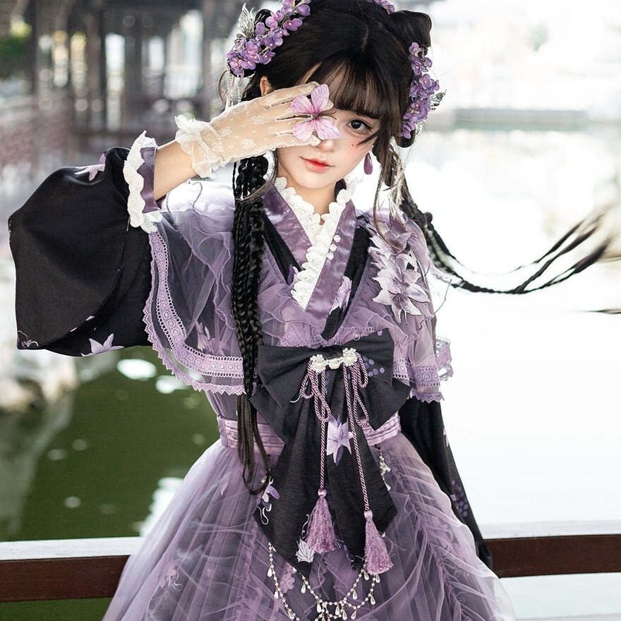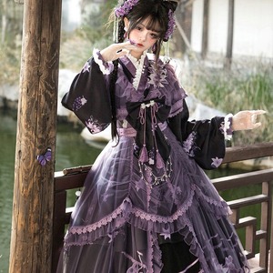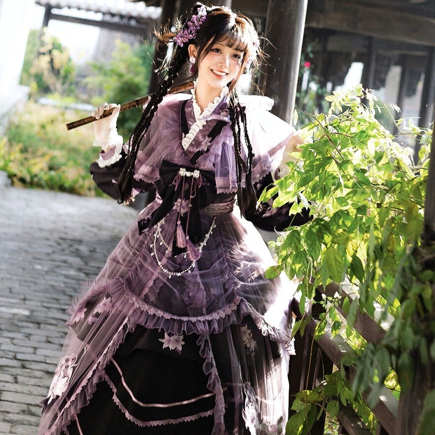 落ち着いた紫と黒を基調に、和風の袖デザインとレース・チュールを重ねた、初心者でも取り入れやすい「クラシカルロリィタ」3点セットです。甘さを抑えた幻想的な佇まいで、撮影や舞台、特別なイベントシーンにしっかり映える一着です。