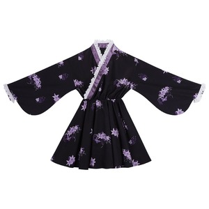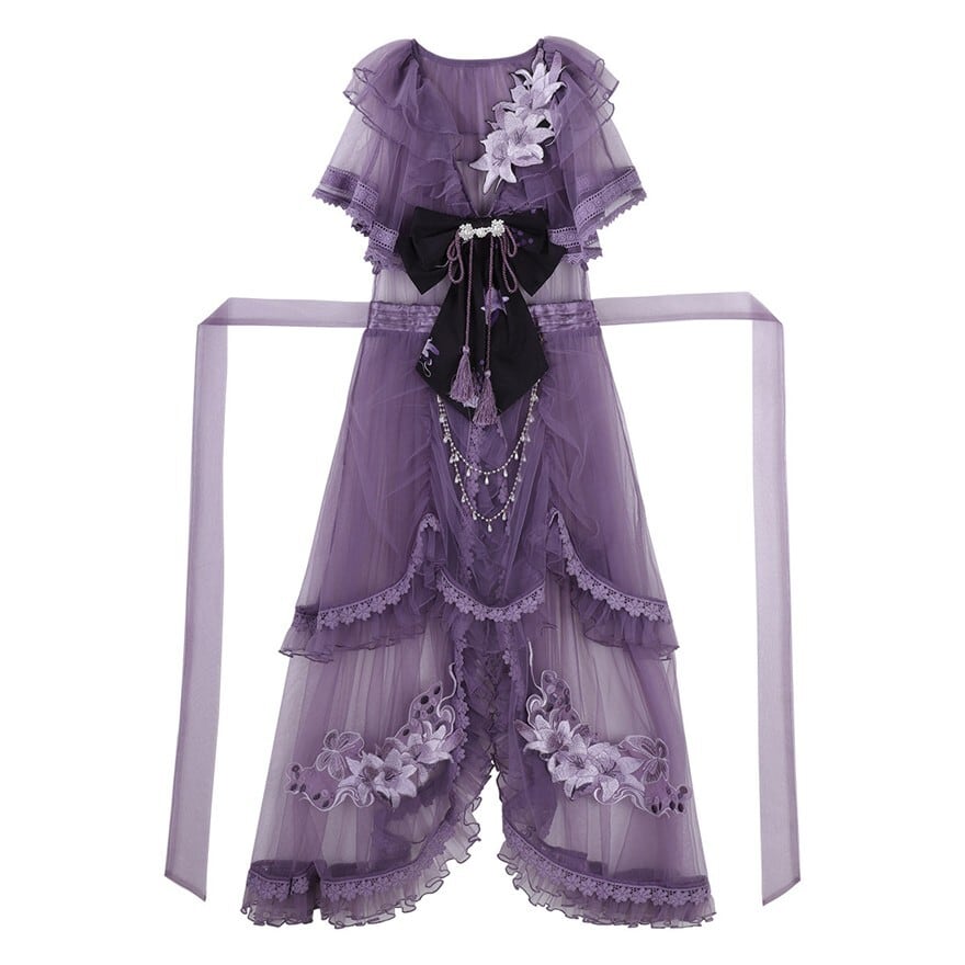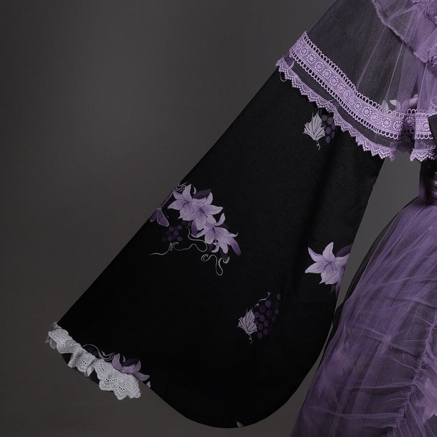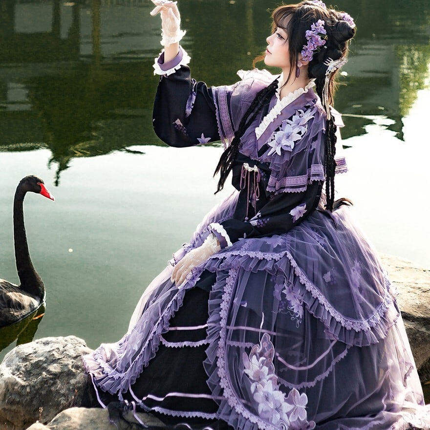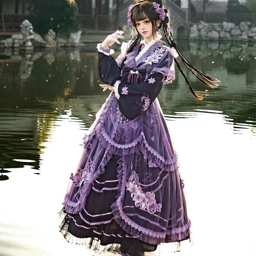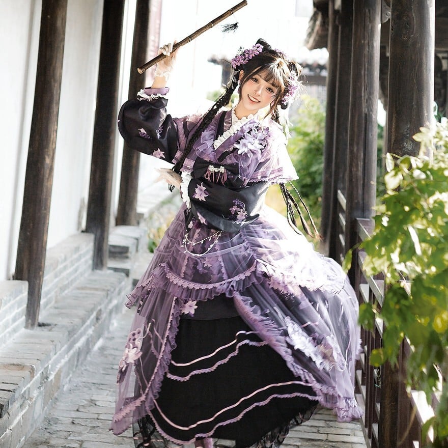 落ち着いた紫と黒を基調に、和風の袖デザインとレース・チュールを重ねた、初心者でも取り入れやすい「クラシカルロリィタ」3点セットです。甘さを抑えた幻想的な佇まいで、撮影や舞台、特別なイベントシーンにしっかり映える一着です。