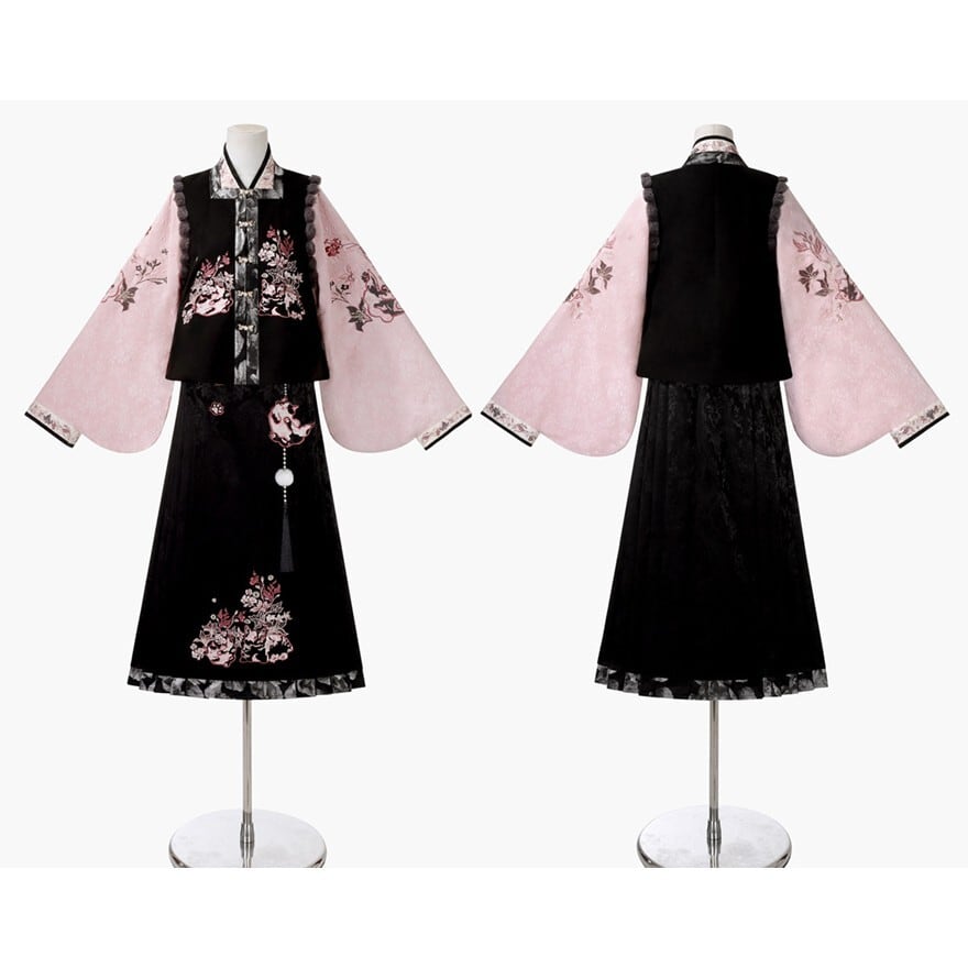 【和×中華融合】花刺繍ロリータ完全セット|黒地×桜ピンク広袖|撮影会映え|タッセル付き|和風イベント最適