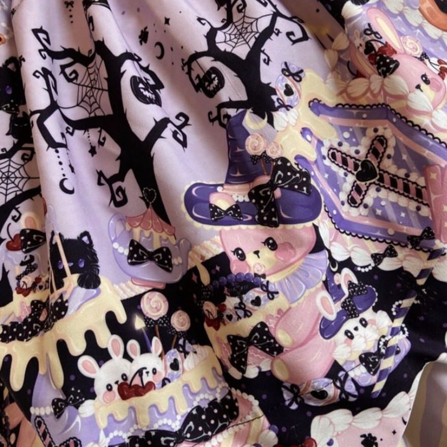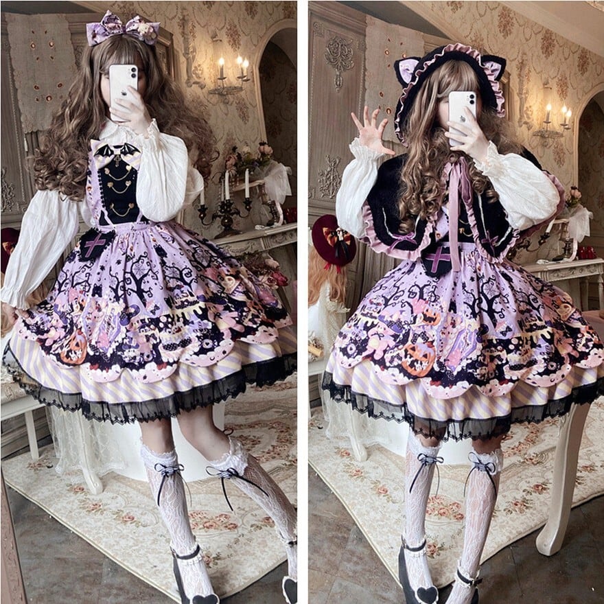 秘密の猫耳ケープで愛らしく 闇可愛いハロウィン柄ジャンパースカート ブラウス 3点セット