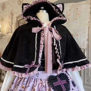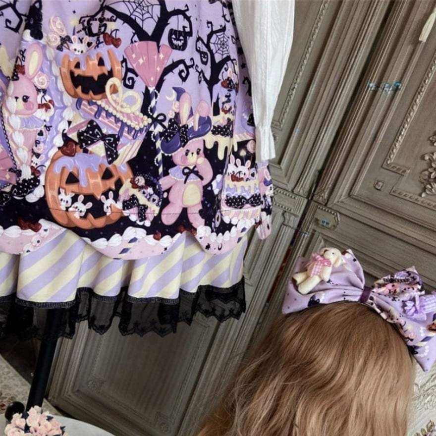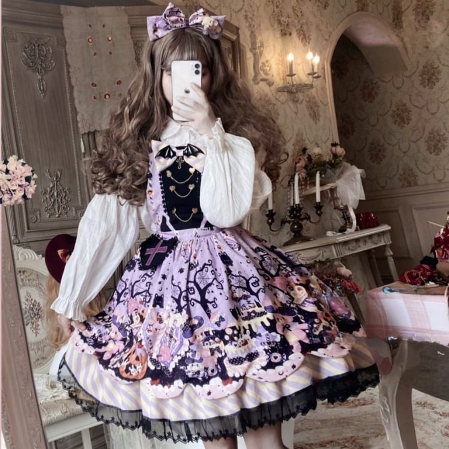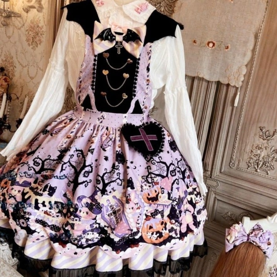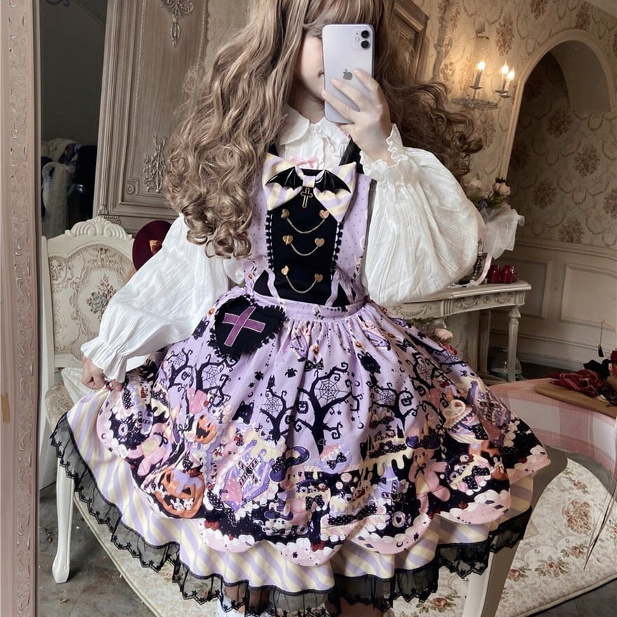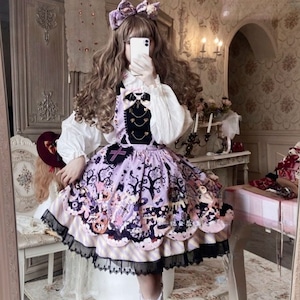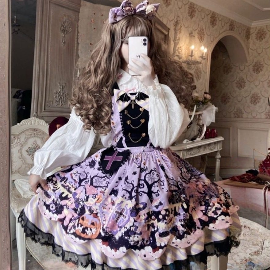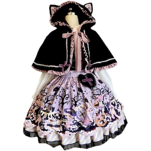 黒×ラベンダーの落ち着いた配色に、ハロウィンモチーフと猫耳ケープを組み合わせた、初心者にも取り入れやすい「ゴシックロリィタ」3点セットです。ジャンパースカート・白ブラウス・ヘッドドレスが揃っており、初めてでも世界観のあるコーディネートが完成します。