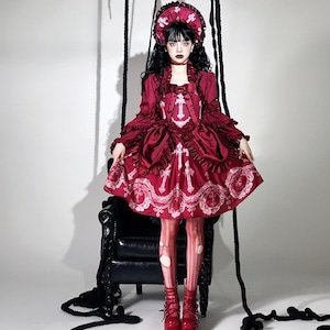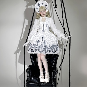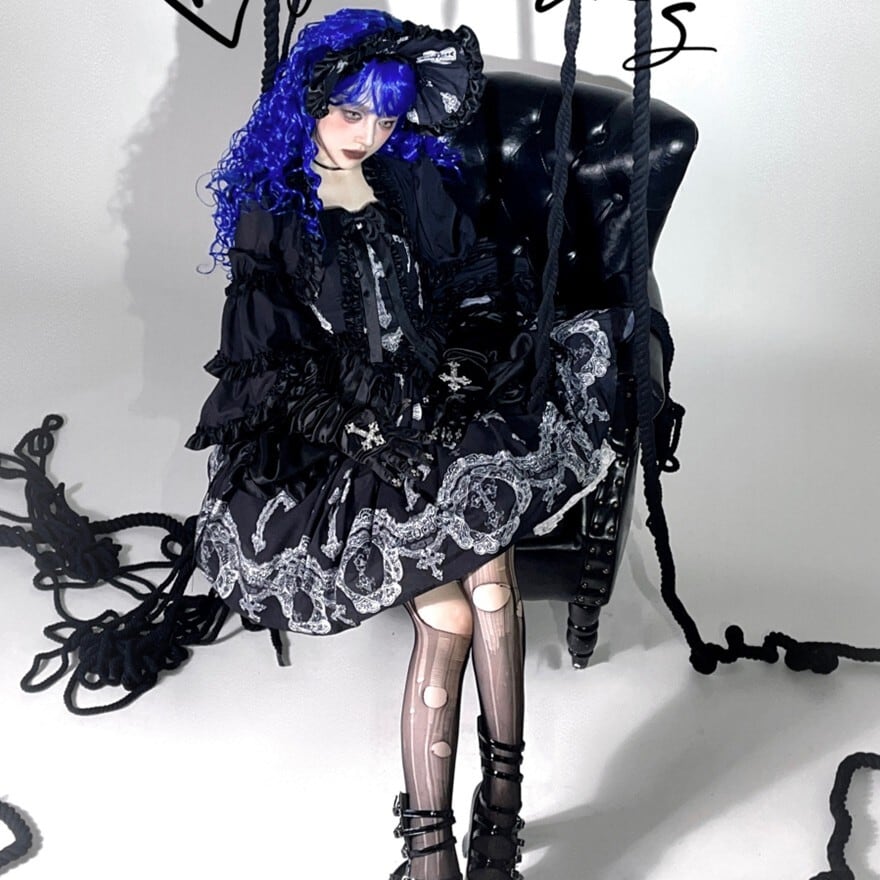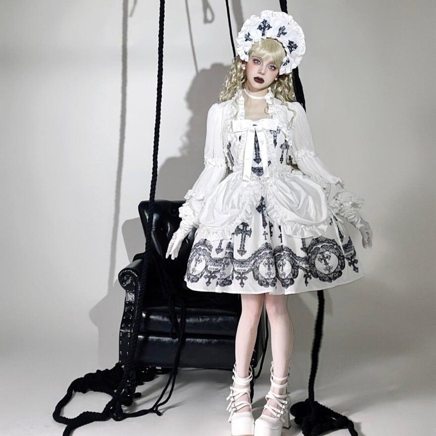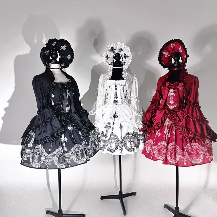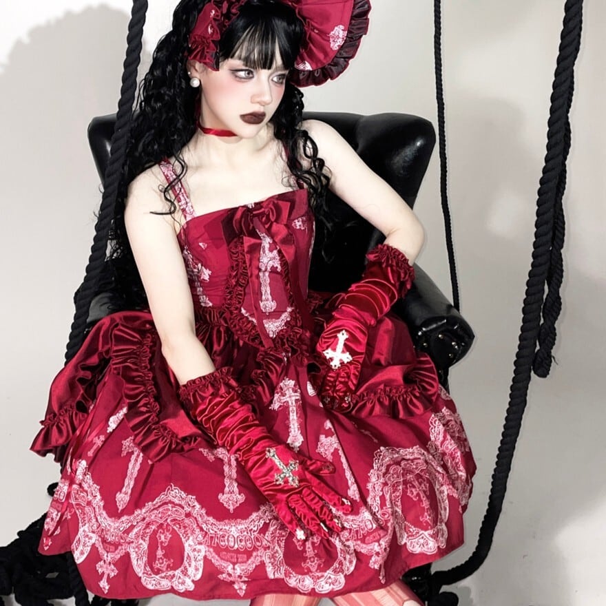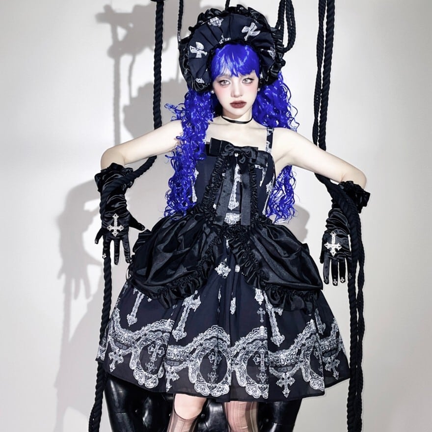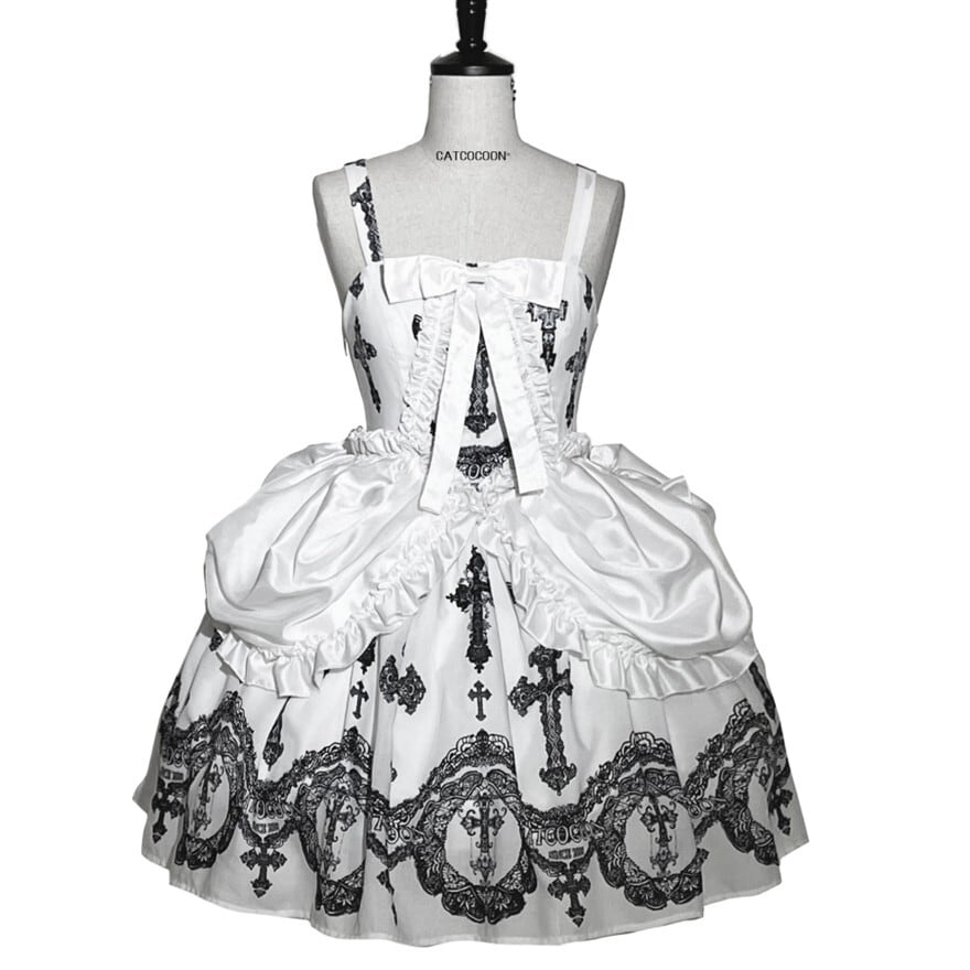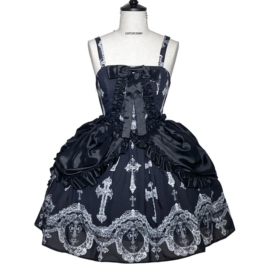重厚感のある十字架プリントとバッスル風シルエットを組み合わせた、ゴシックロリィタジャンパースカートです。華やかさがありながら甘さを抑えたデザインで、ロリータ初心者や大人の方でも安心して着用でき、ライブやコンカフェ衣装としても映える一着です。