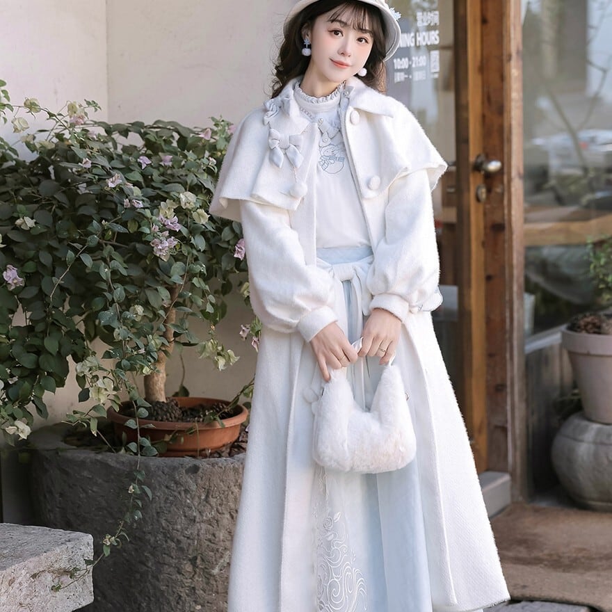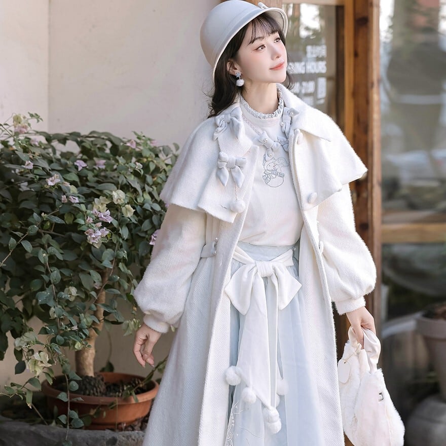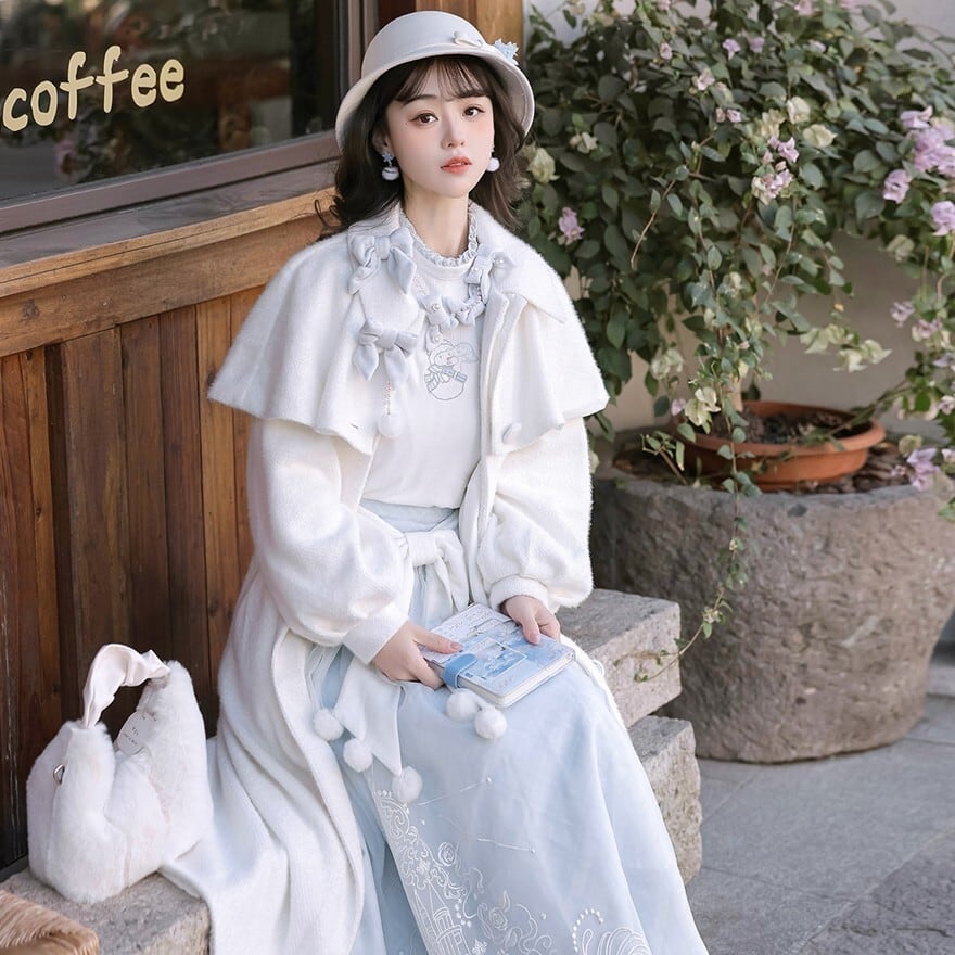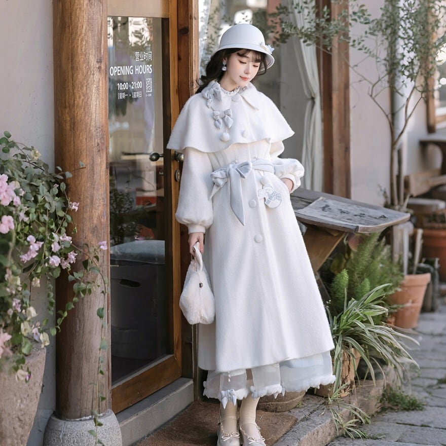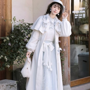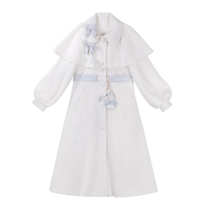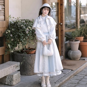 ホワイトとペールブルーの淡い配色でまとめた、初心者でも安心して着られる「スウィートロリータ」3点セットです。ケープ付きコートが全体をやさしく包み込み、甘さを抑えた上品な印象に。冬のお茶会やお出かけ、写真撮影まで幅広く活躍する、統一感のあるコーディネートが完成します。
