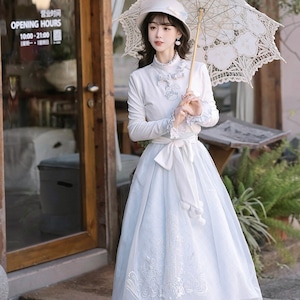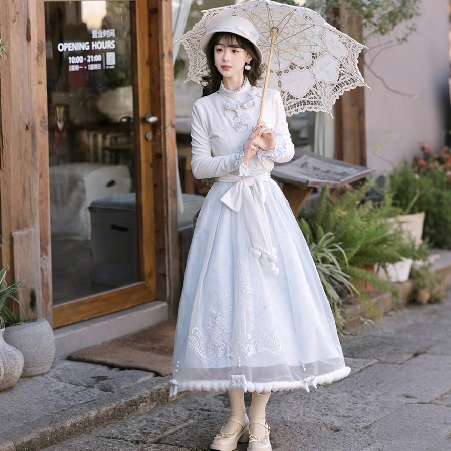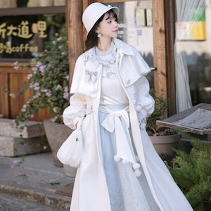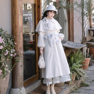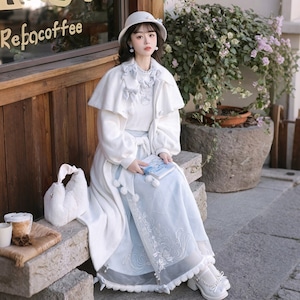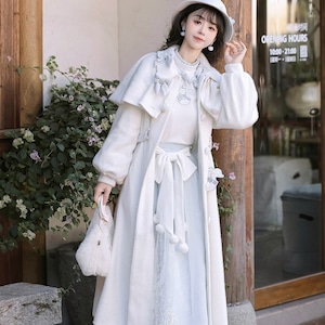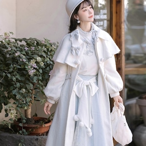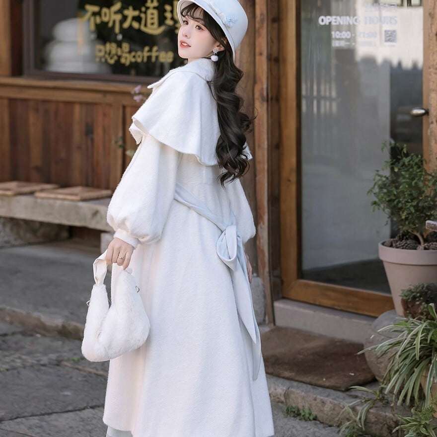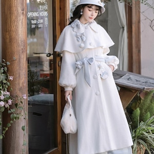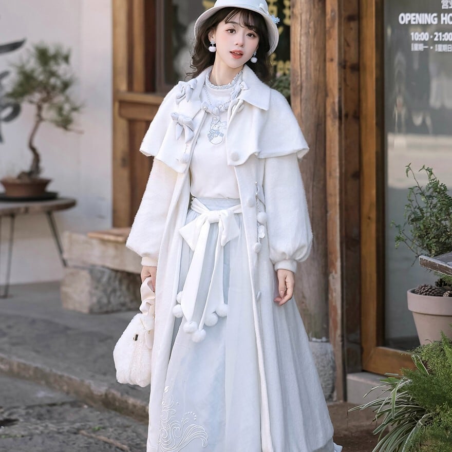 ホワイトとペールブルーの淡い配色でまとめた、初心者でも安心して着られる「スウィートロリータ」3点セットです。ケープ付きコートが全体をやさしく包み込み、甘さを抑えた上品な印象に。冬のお茶会やお出かけ、写真撮影まで幅広く活躍する、統一感のあるコーディネートが完成します。