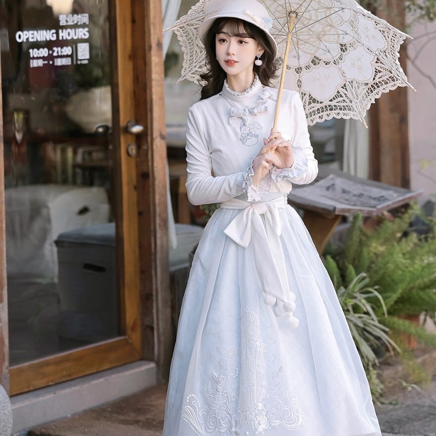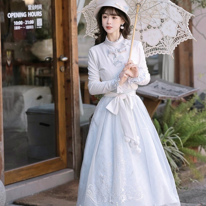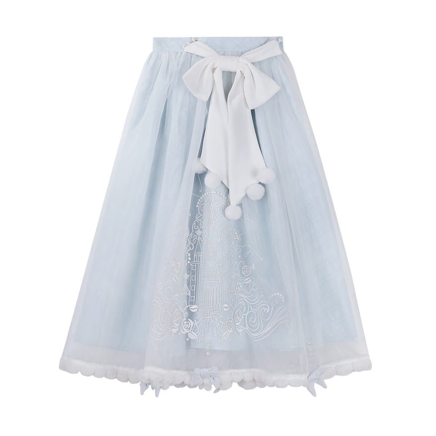 - スカートにはお城と雪だるまモチーフの刺繍を施し、童話のような世界観を演出