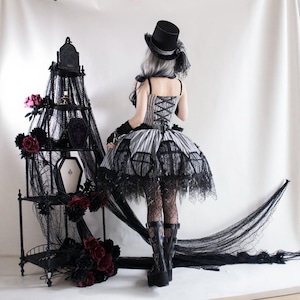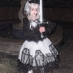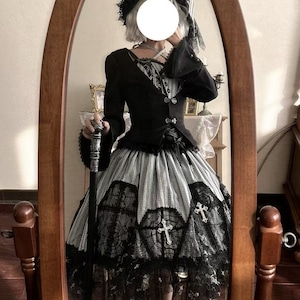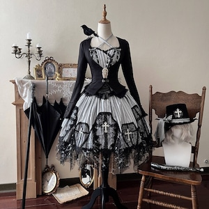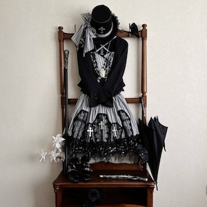 重厚なブラック×ホワイトを基調に、教会モチーフと十字架装飾をあしらった、初心者でも取り入れやすいゴシックロリータのクラシカルセットです。甘さを抑えた落ち着いたデザインで、お茶会や撮影など特別なシーンでも大人らしく美しく映える一着です。