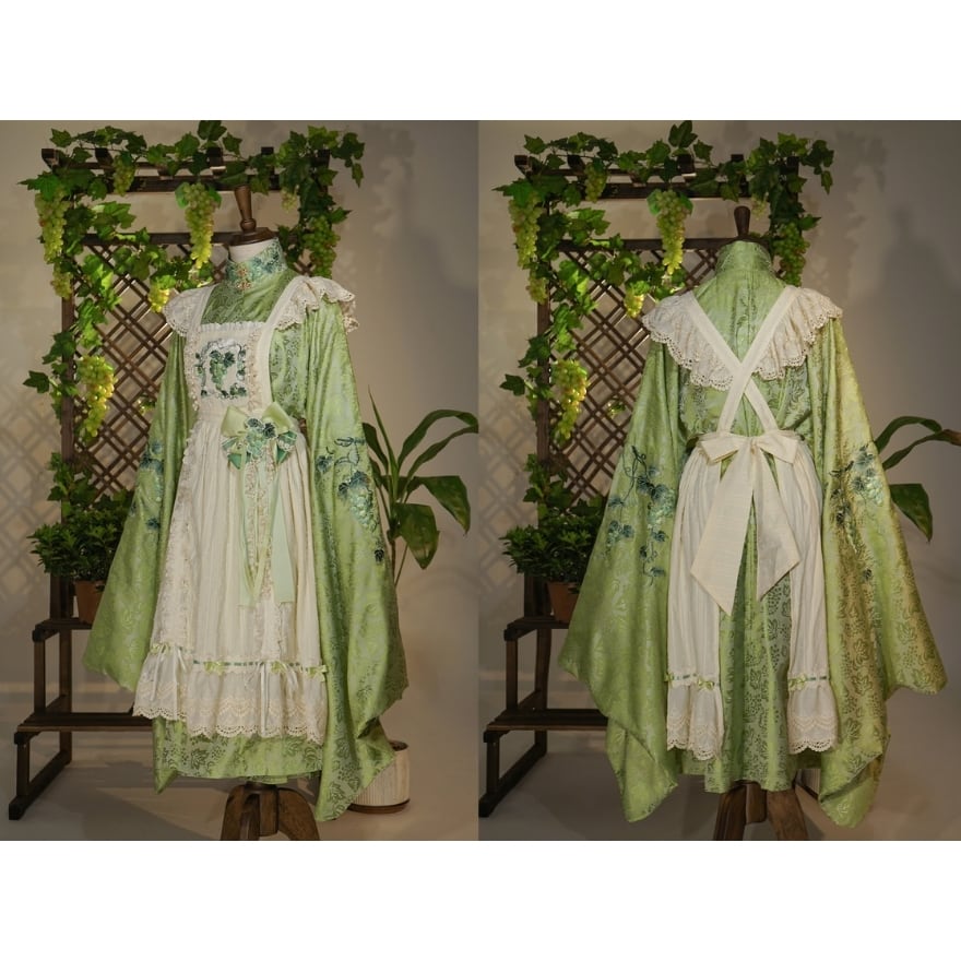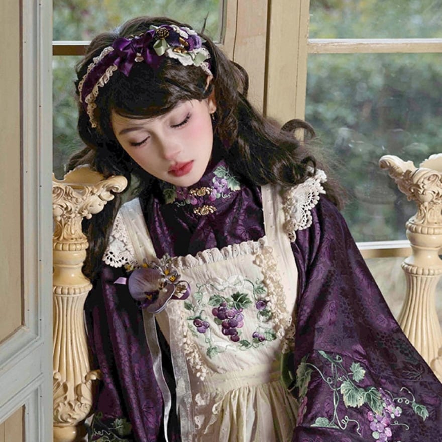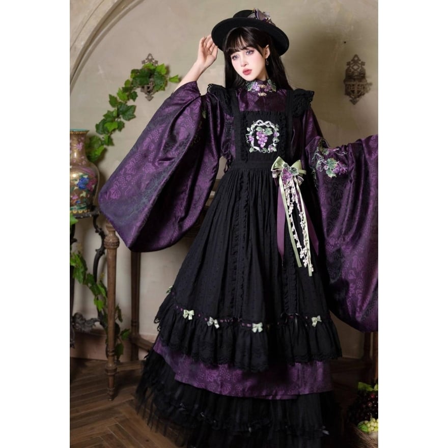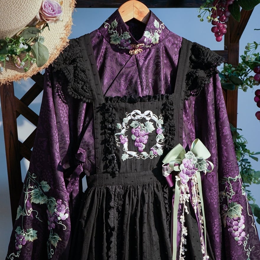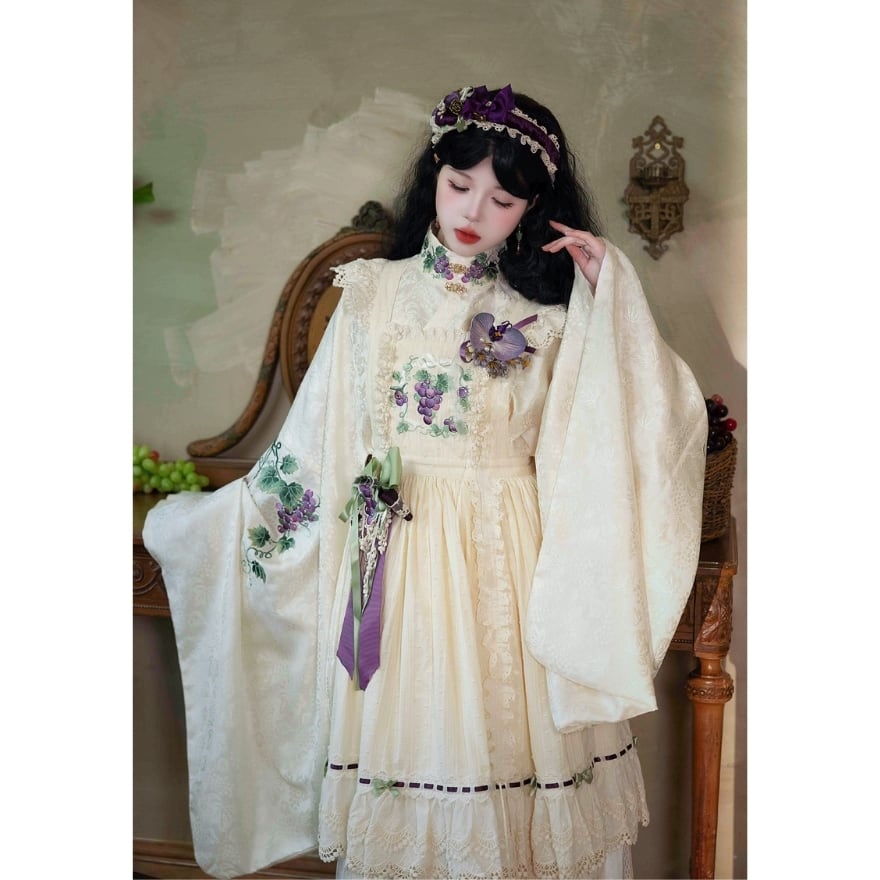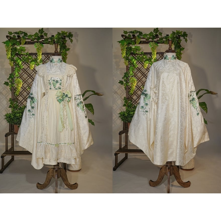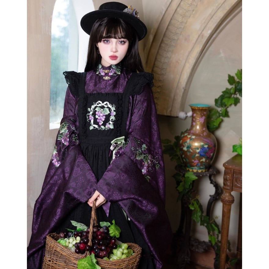 大きく広がる着物袖シルエットと、葡萄や草花を思わせる総柄デザインが特徴。