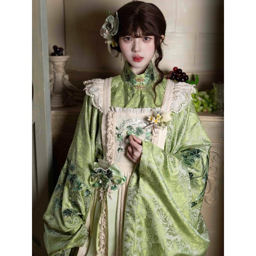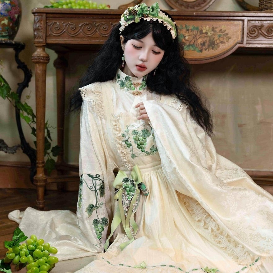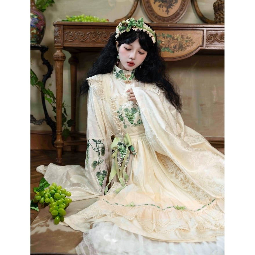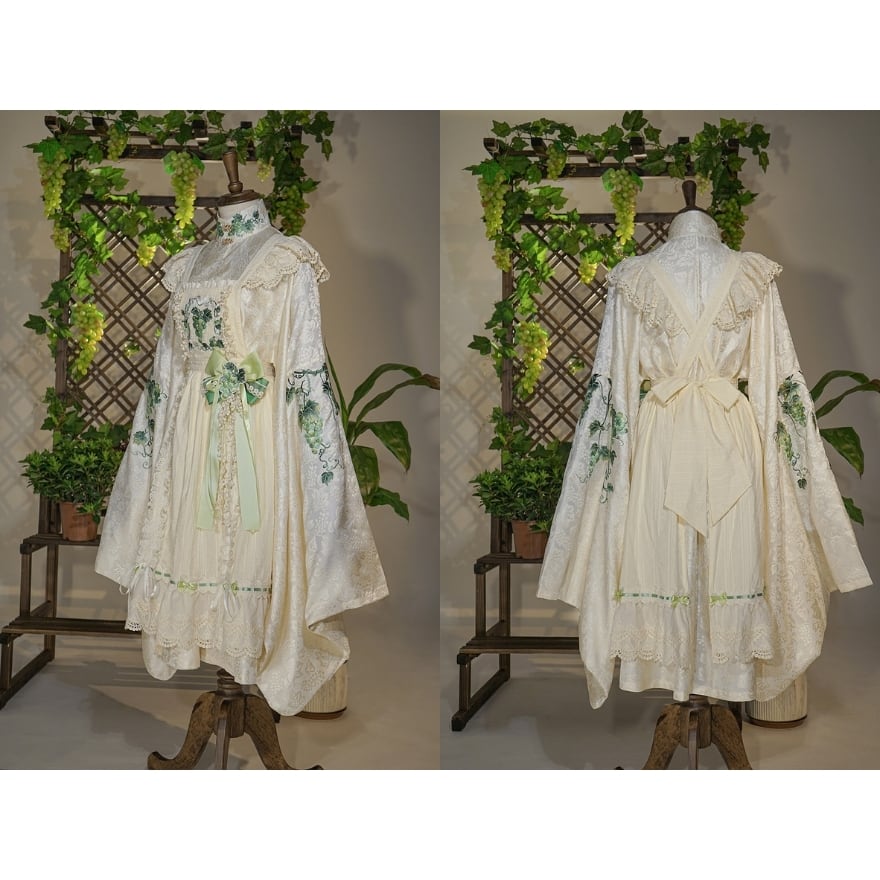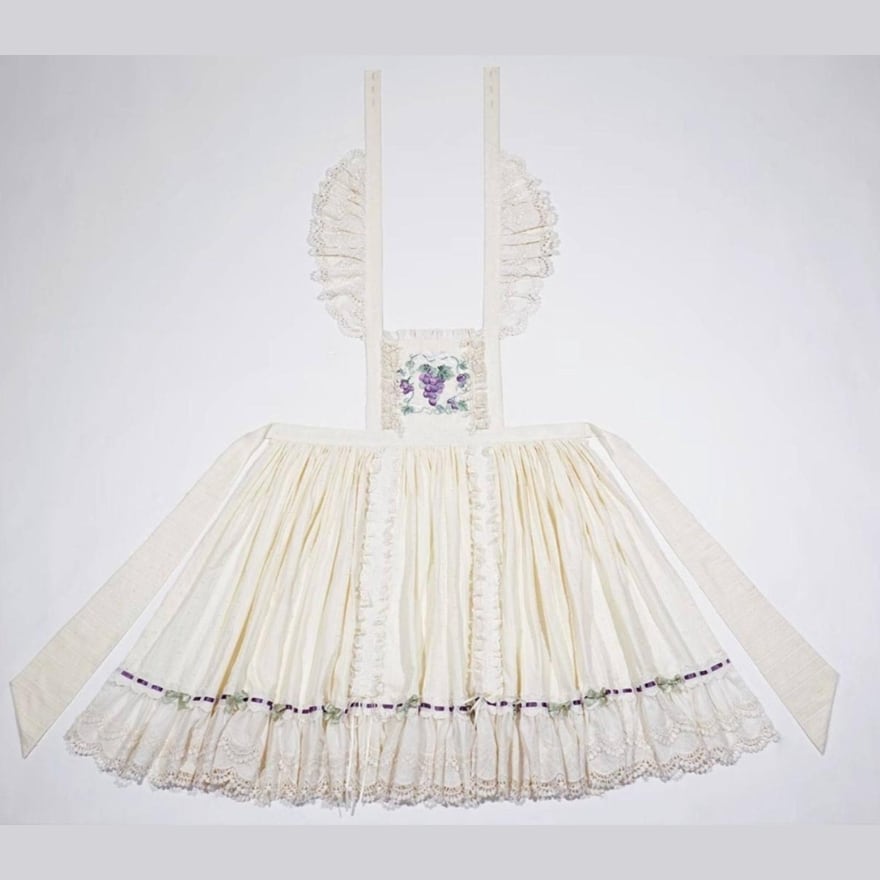 胸当て部分に施された葡萄刺繍と、繊細なレース使いが特徴。