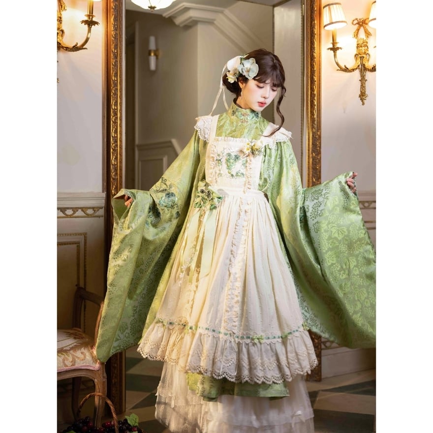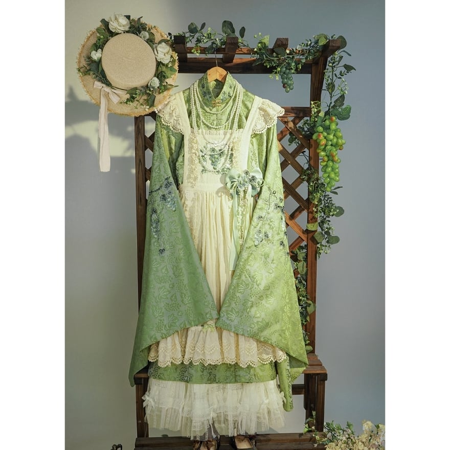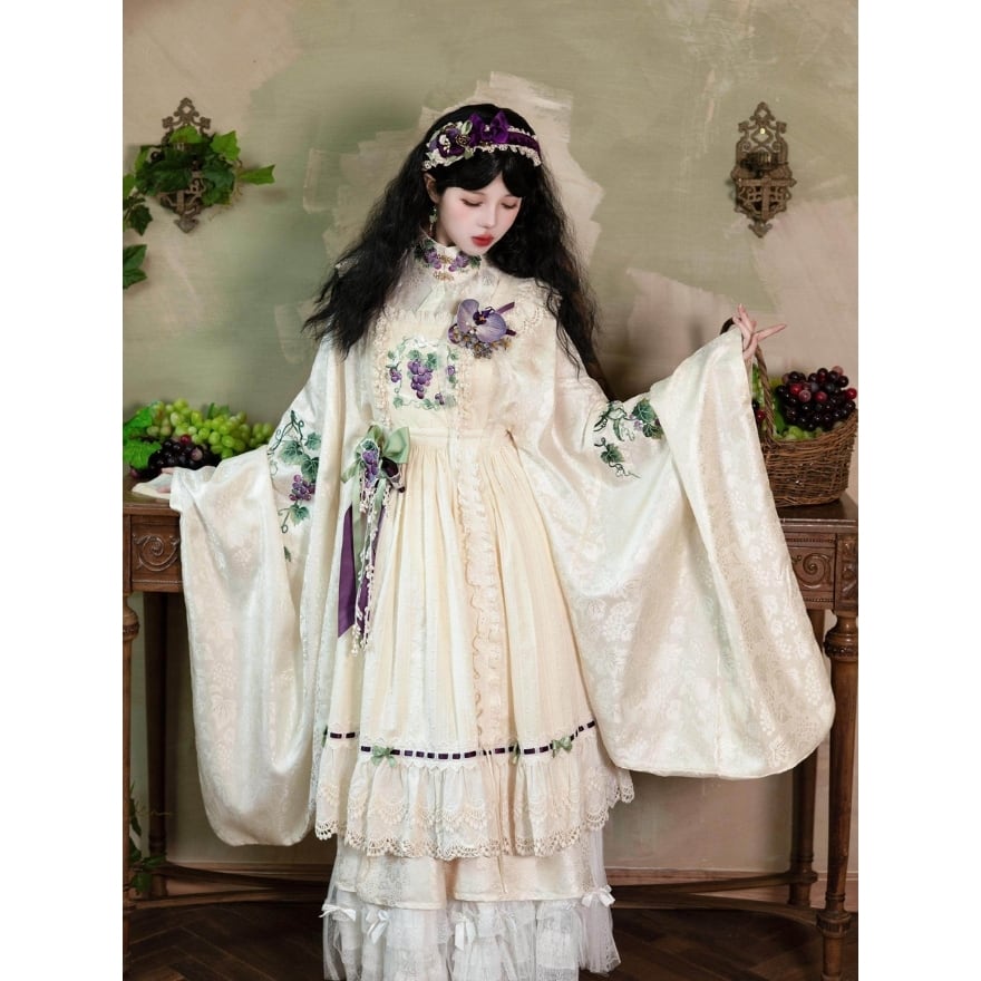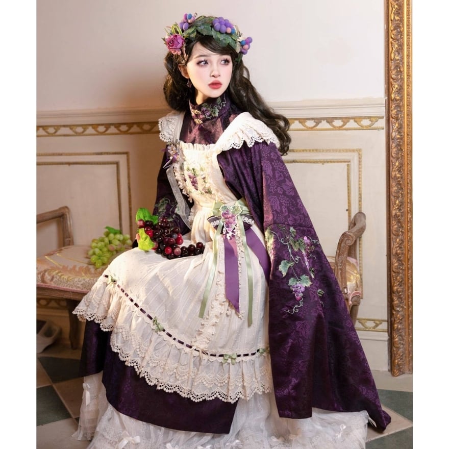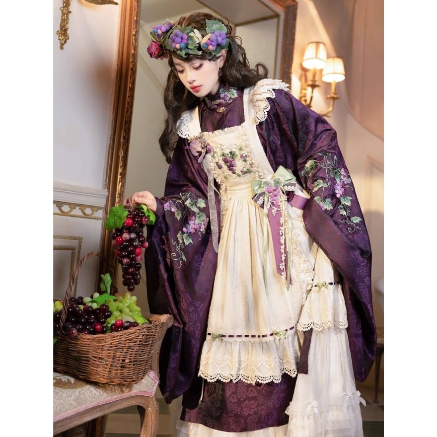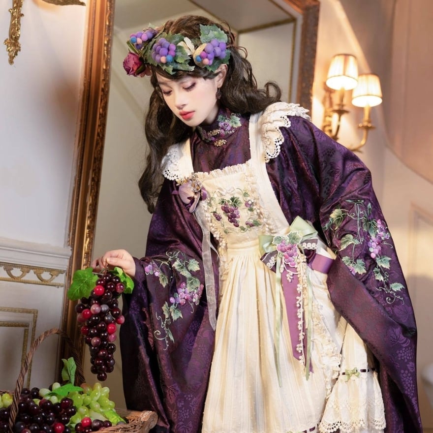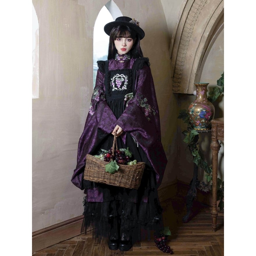 初心者でも取り入れやすい 和風ロリータの葡萄刺繍エプロン風ジャンパースカート|撮影・イベント向け