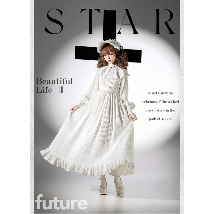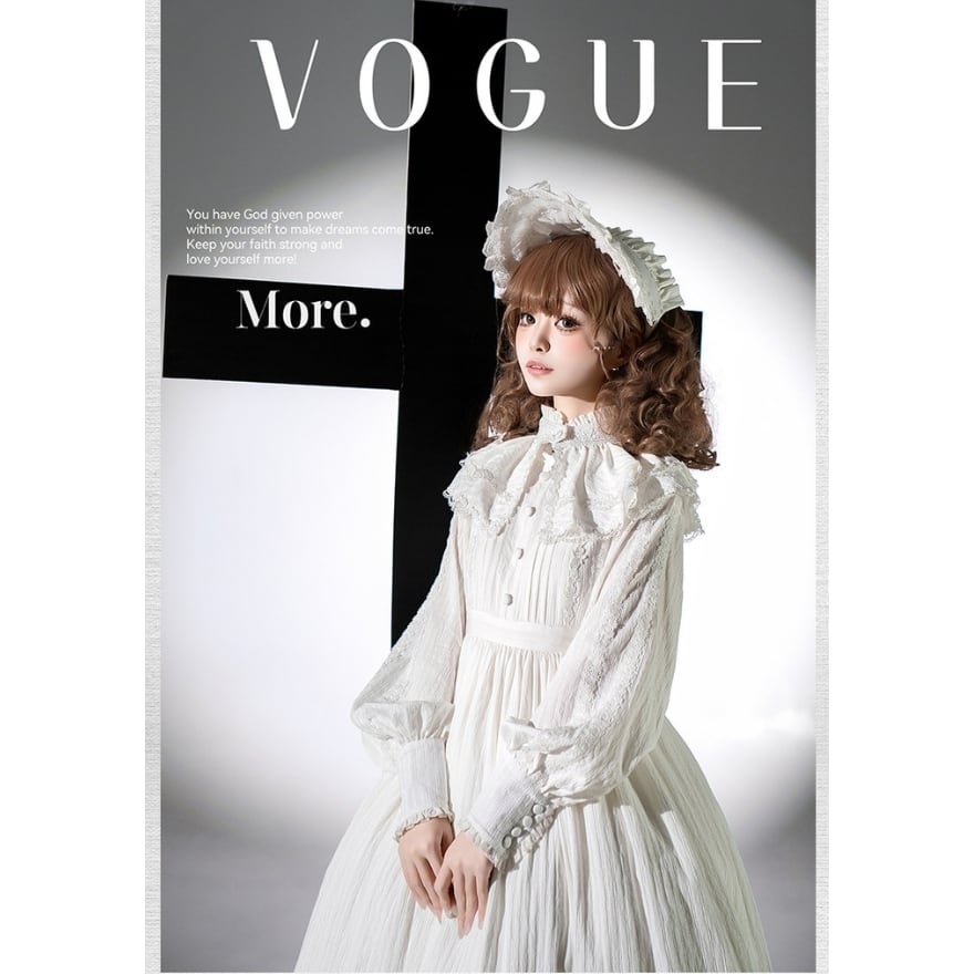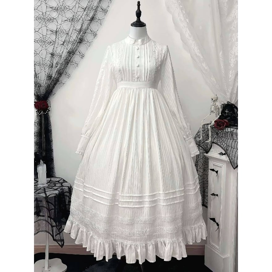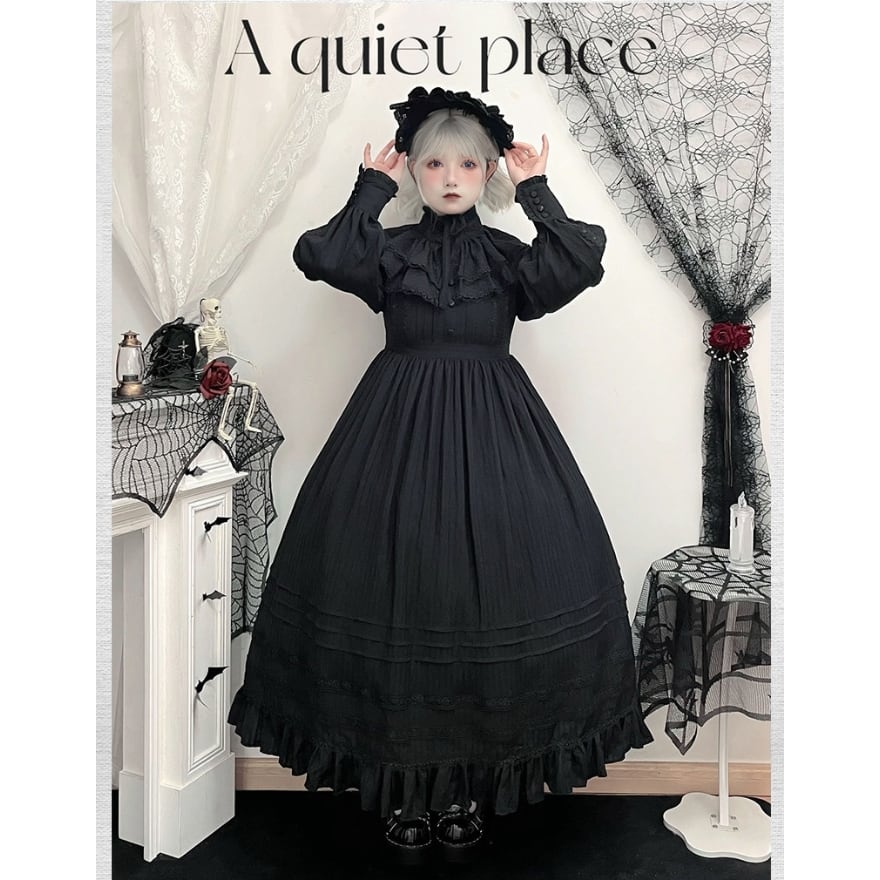 装飾は控えめながらもレースやフリルを重ねた構造で、ロリータ初心者でも世界観を崩さず着用しやすい一着です。