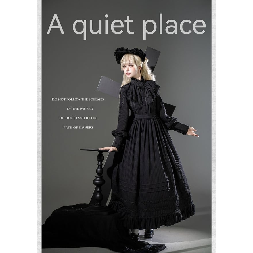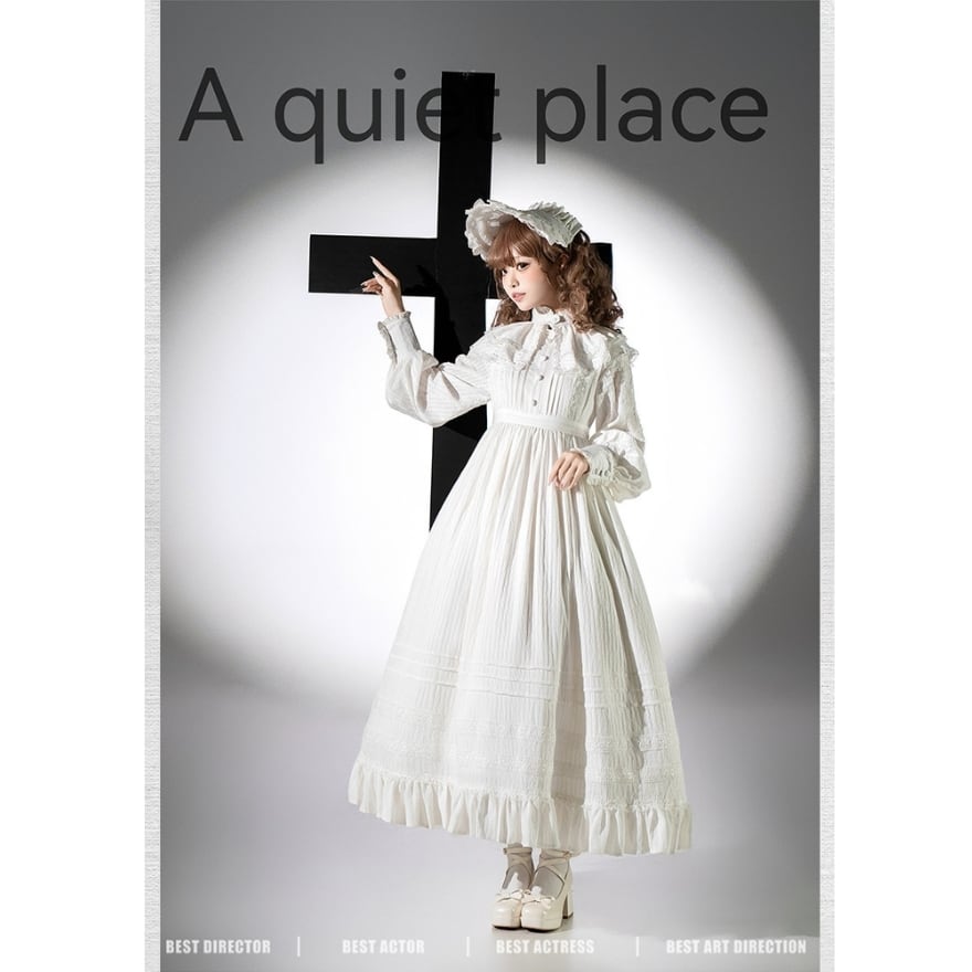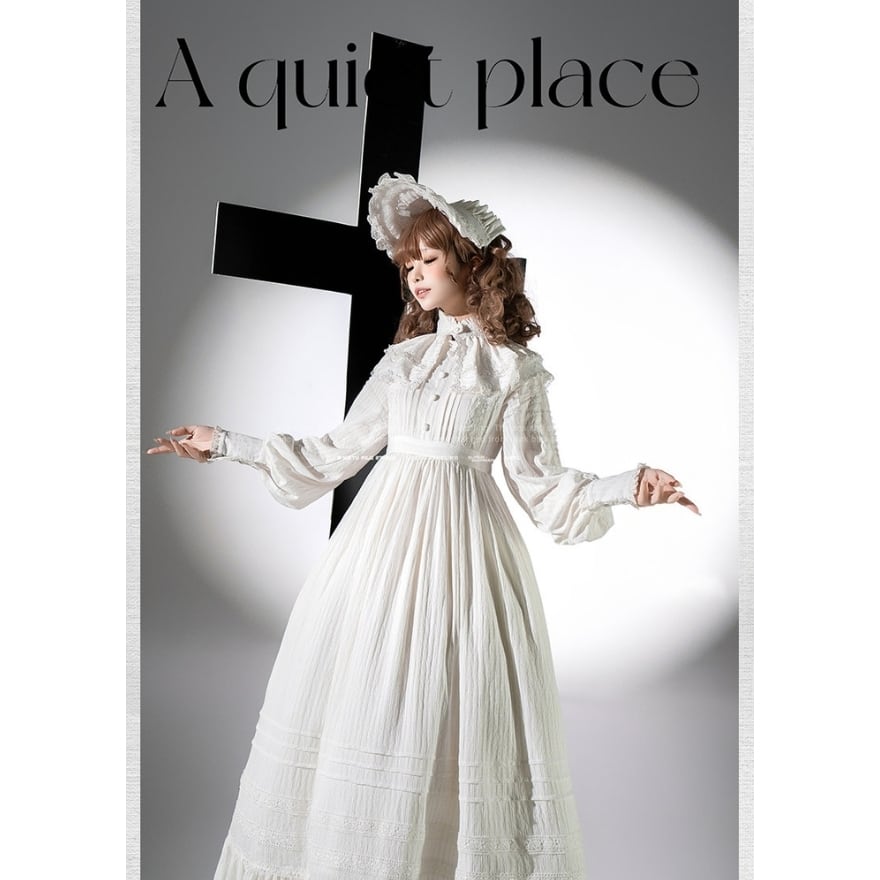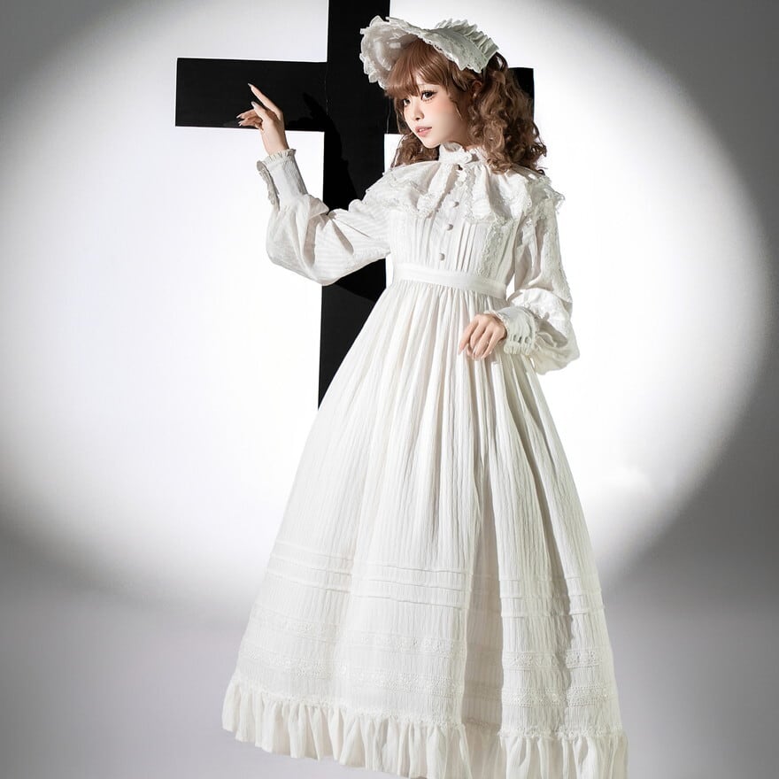 本商品は、長袖ロングワンピース・付け襟・ボンネットの3点で構成された、クラシカルロリータ向けセットアップです。