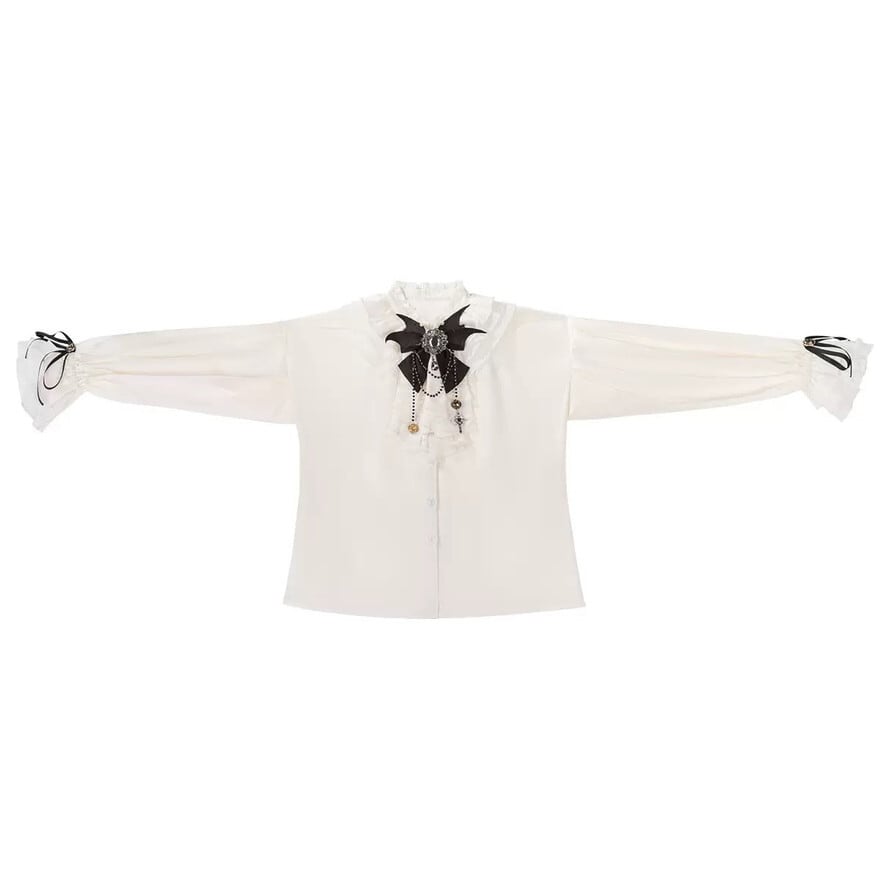 ・ブラウス:白基調、フリル襟とリボン装飾付き、長袖仕様