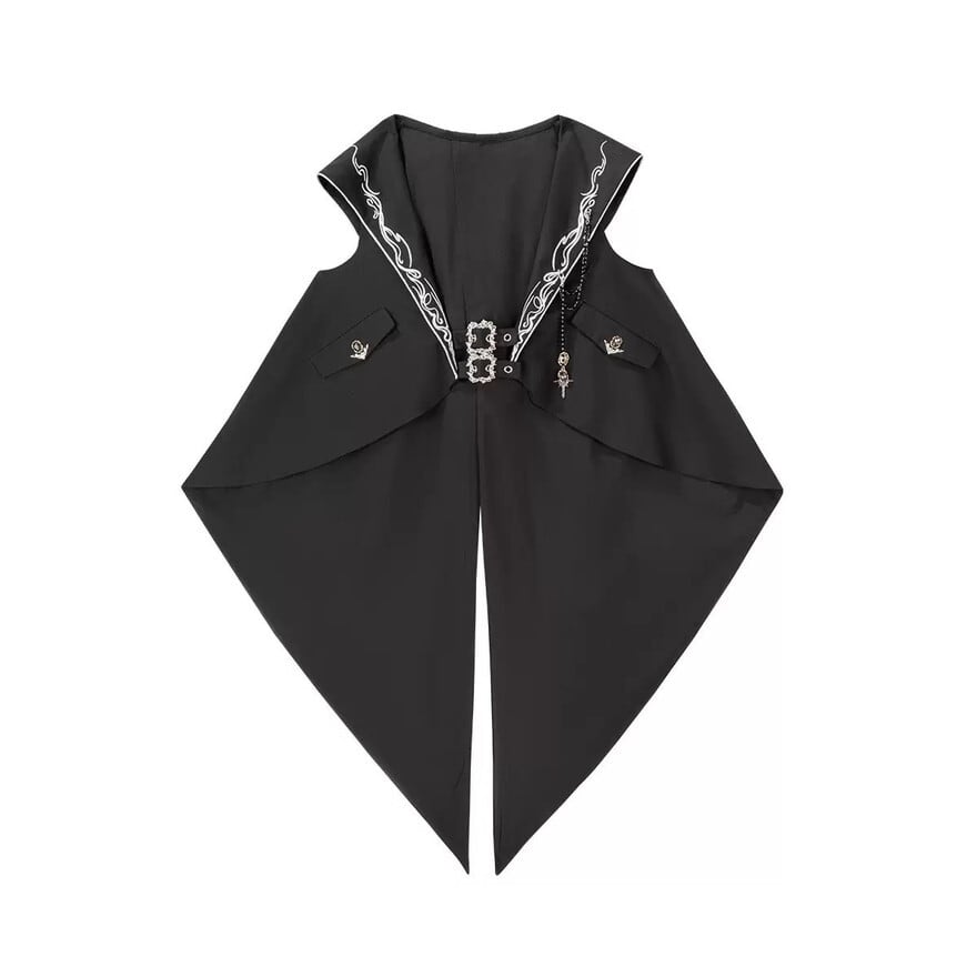 ・ベスト:黒地にシルバー調刺繍とチェーン装飾、燕尾風の後ろ丈デザイン