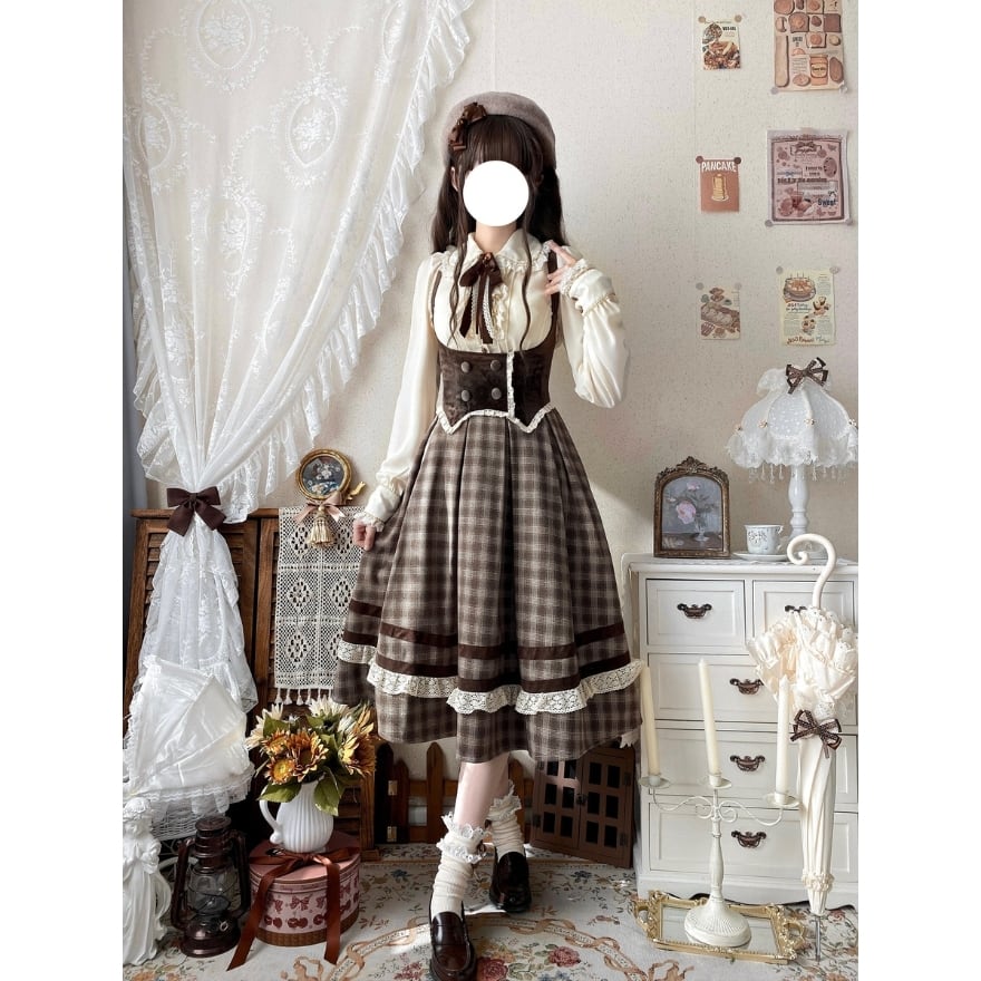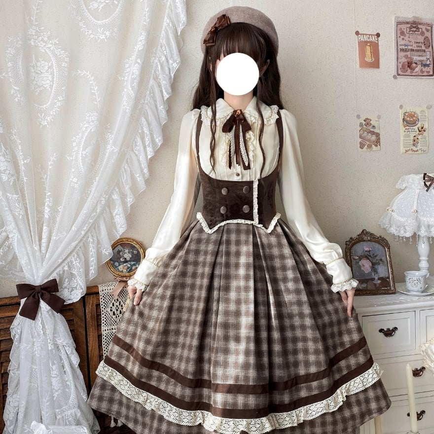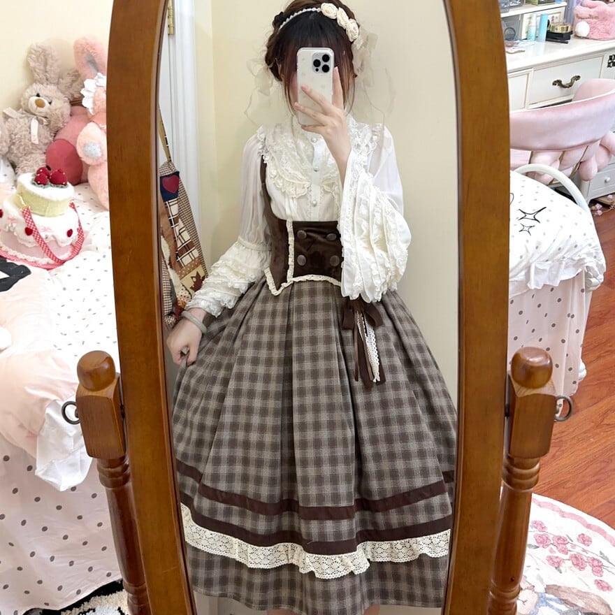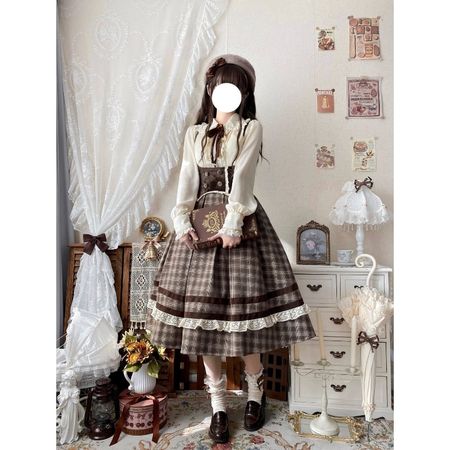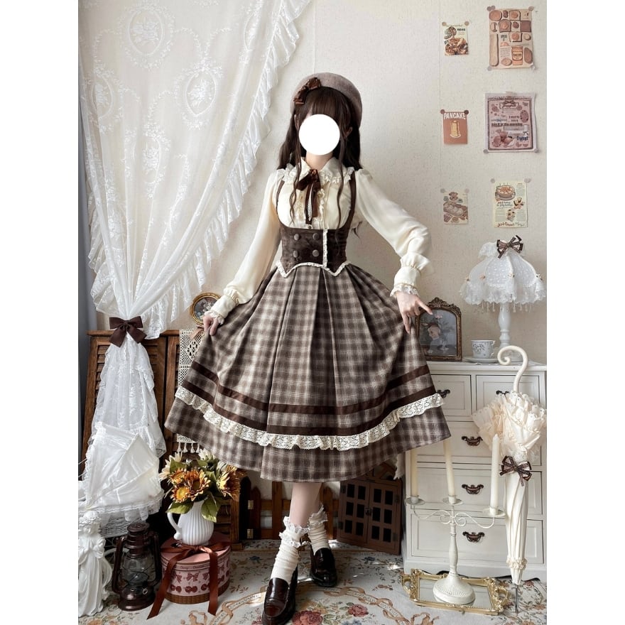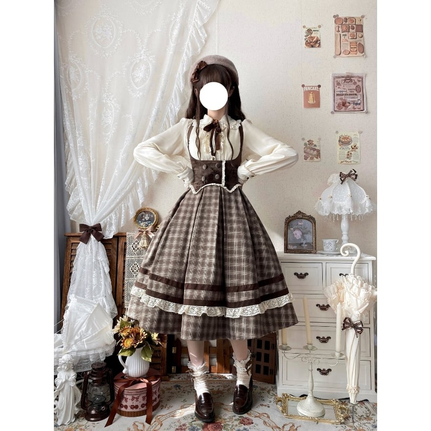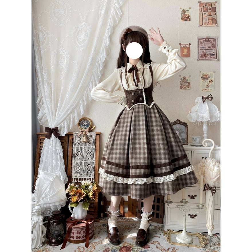 クラシカルロリータ向け チェック柄ブラウンジャンパースカート 胸元切替仕様で体型調整しやすい一着