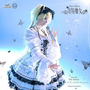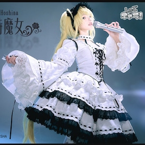 白黒レースのアイドル系ゴシックロリィタワンピース|クロスリボン×フレア袖ステージ衣装