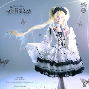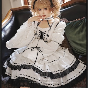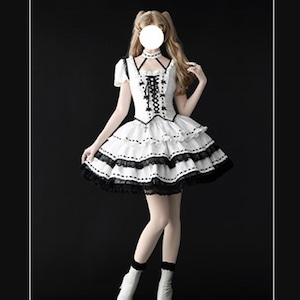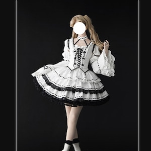白を基調に黒のレースとリボンで引き締めた、クラシカルロリィタ調のセットアップ。編み上げ仕様の上衣と、ボリューム感のある下裙で立体的なシルエットを構成する。甘さを抑えた配色とフリル使いにより、写真からは上品で落ち着いた印象が確認でき、装飾性と実用性のバランスを重視した一着。