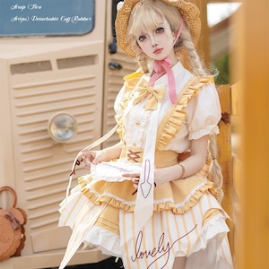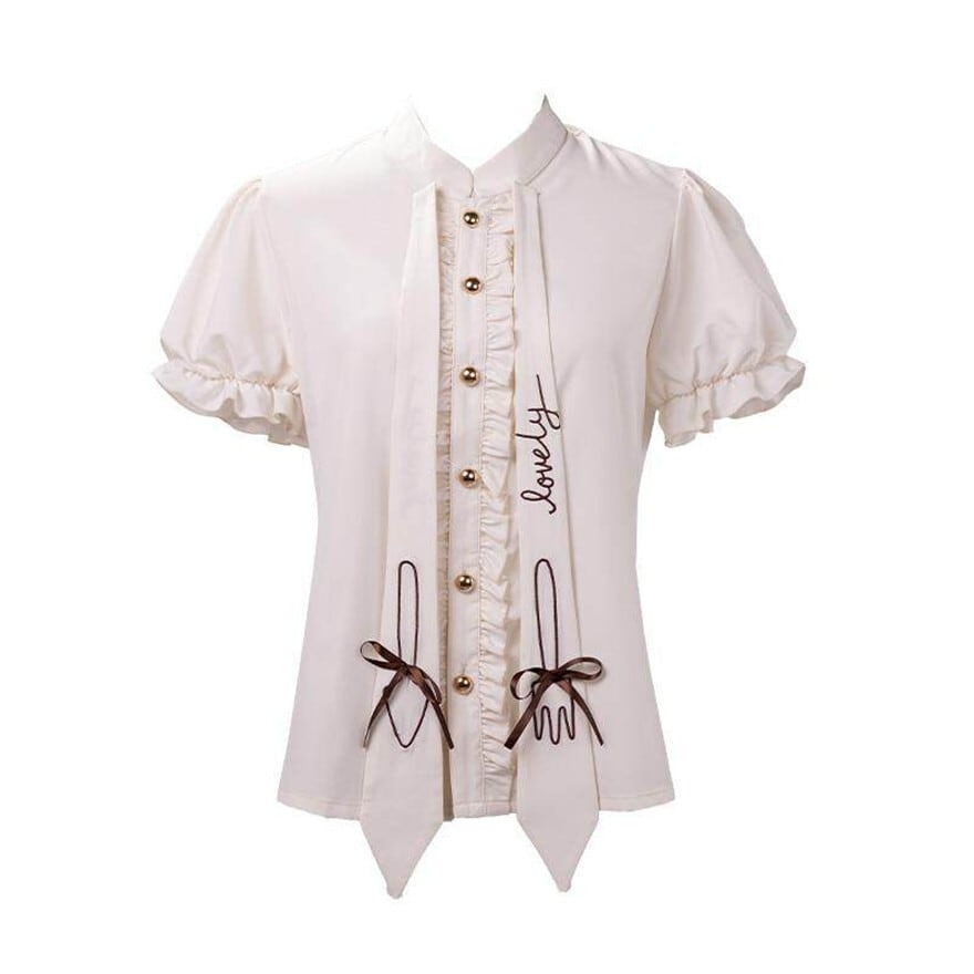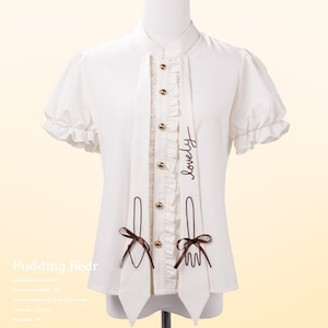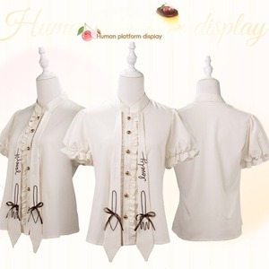 スタンドカラーにフリル前立てを配した、ロリィタ向け半袖ブラウス。前面にはゴールド調ボタンと細リボン、縦に落ちる装飾パネルをあしらい、甘さと端正さを両立している。ジャンパースカートやスカートのインナーとして使いやすく、全体の世界観を崩さずにコーディネートをまとめられる一着。