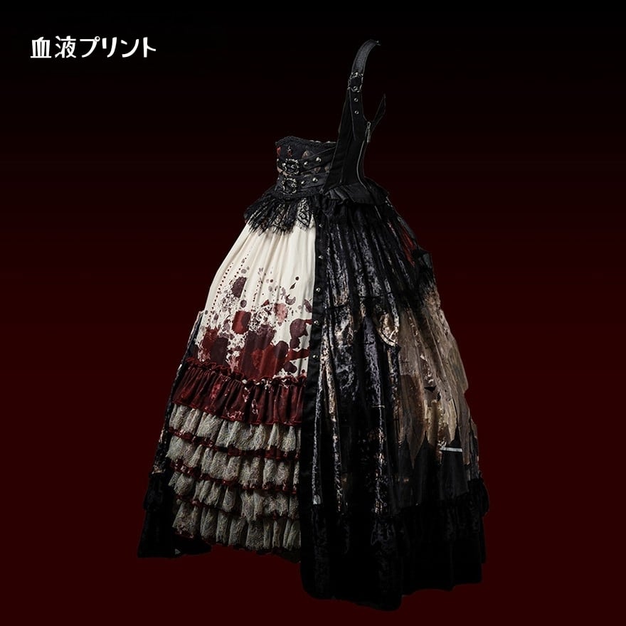 ウエスト部分はコルセット風のハイウエスト設計になっており、ボディーラインを美しく引き締めつつ、何段にも重なったフリルと血液プリントが圧倒的な存在感を演出します。