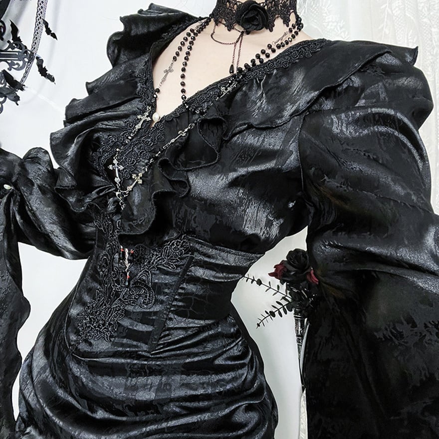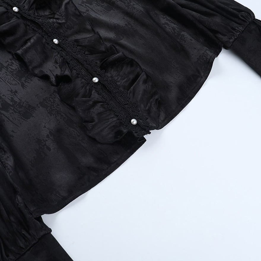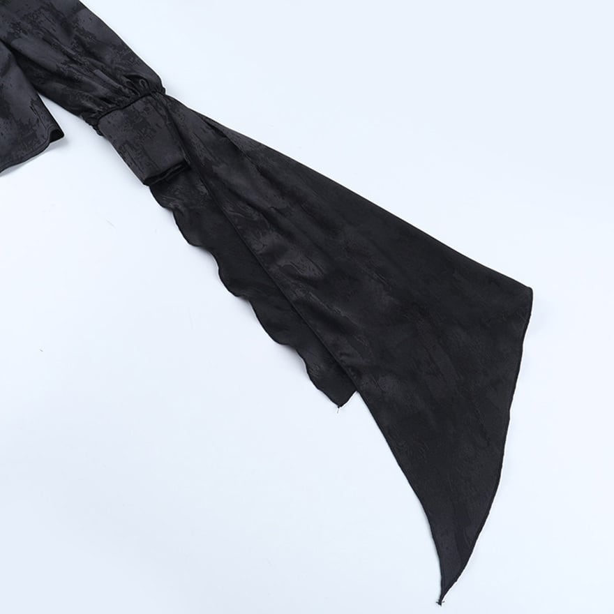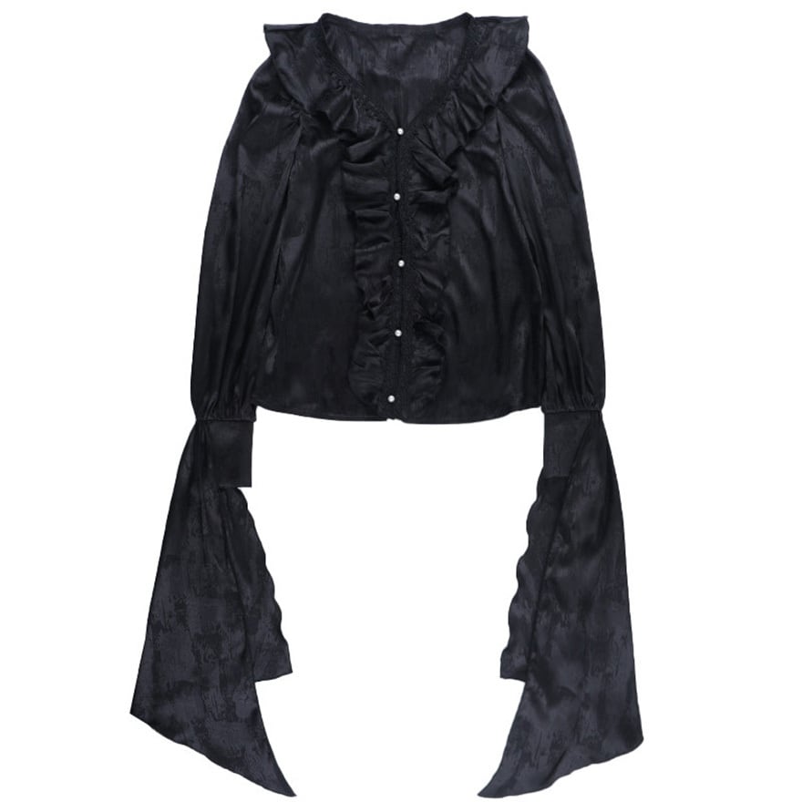 光沢感のあるブラックのジャガード生地に、大胆なフリルと長く伸びた袖のデザインが目を引く、アバンギャルドなゴシックシャツです。