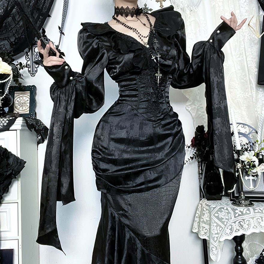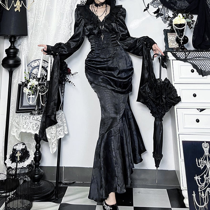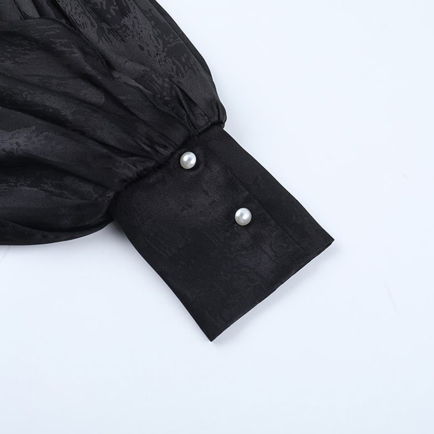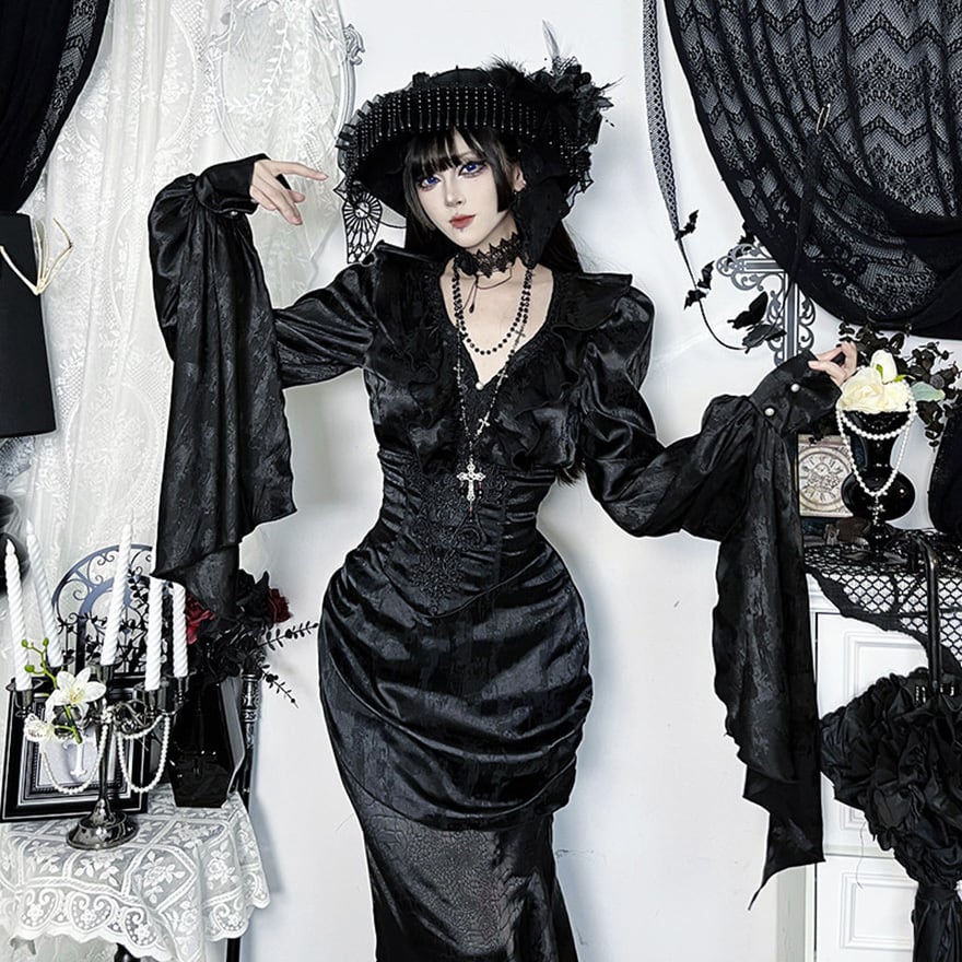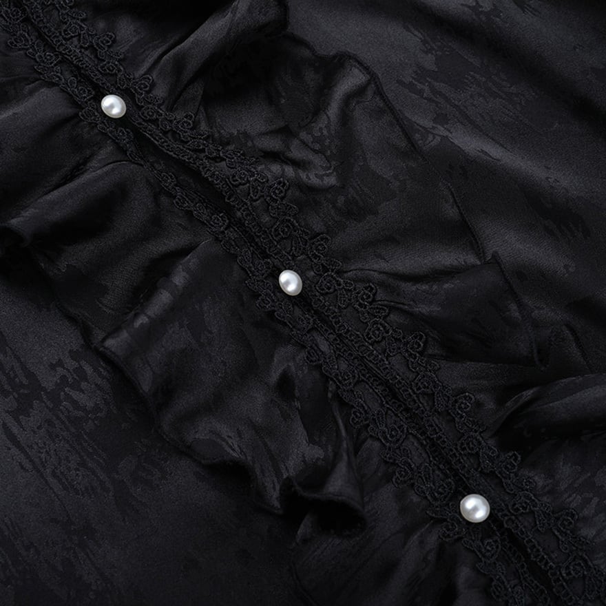 光沢感のあるブラックのジャガード生地に、大胆なフリルと長く伸びた袖のデザインが目を引く、アバンギャルドなゴシックシャツです。
