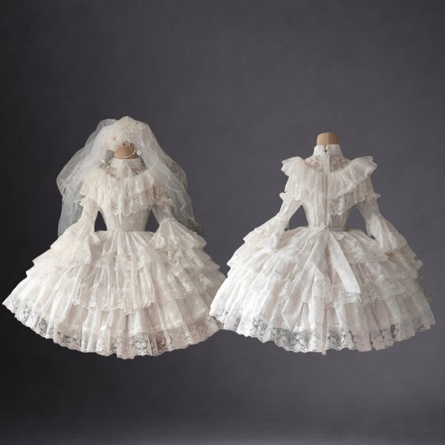 透け感のある繊細なレースを全身にあしらい、袖口には幾重にも重なる華やかなフリルを添えた、細部までこだわり抜いたデザイン。