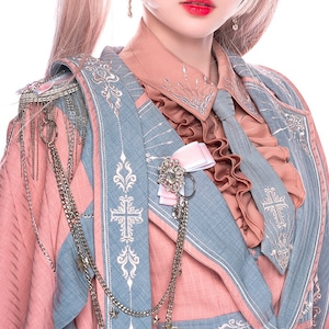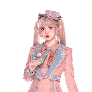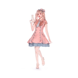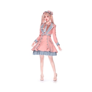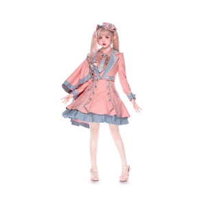淡いピンクを基調に、グレイッシュブルーの配色と刺繍装飾を組み合わせた制服風ロリィタセットアップです。ジャンパースカート、ブラウス、ネクタイに加え、同系色のジャケットを組み合わせた構成で、甘さと端正さのバランスを重視したデザインが特徴です。ウエストラインを程よく強調したシルエットで、重ね着にも対応します。