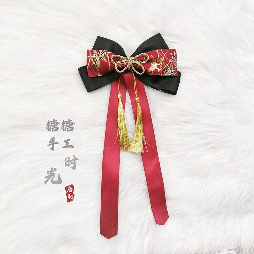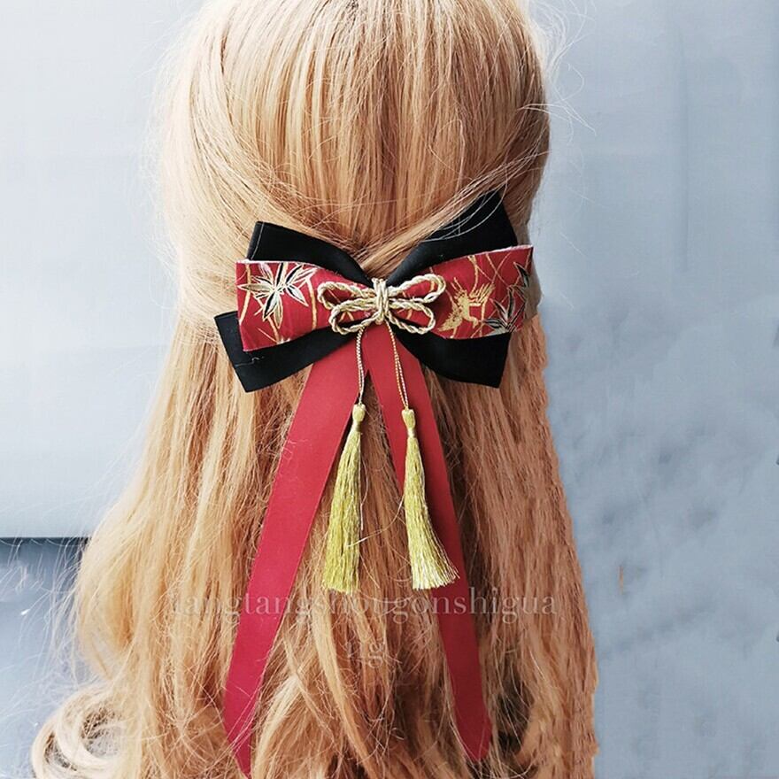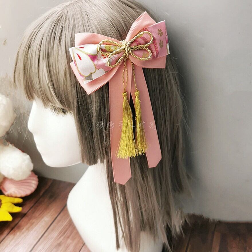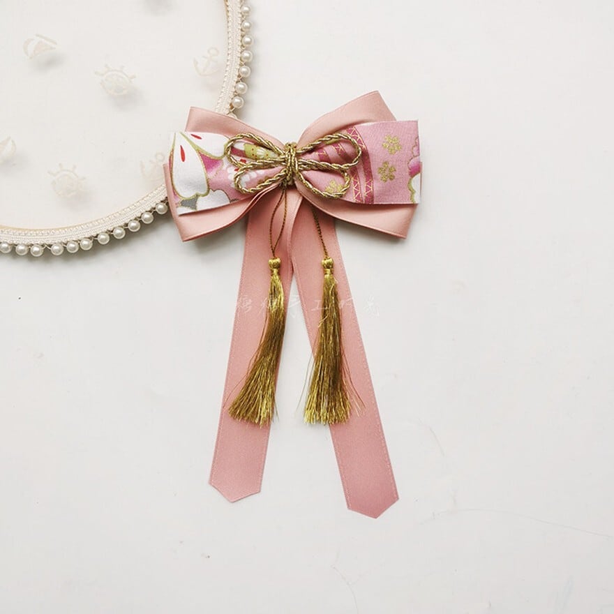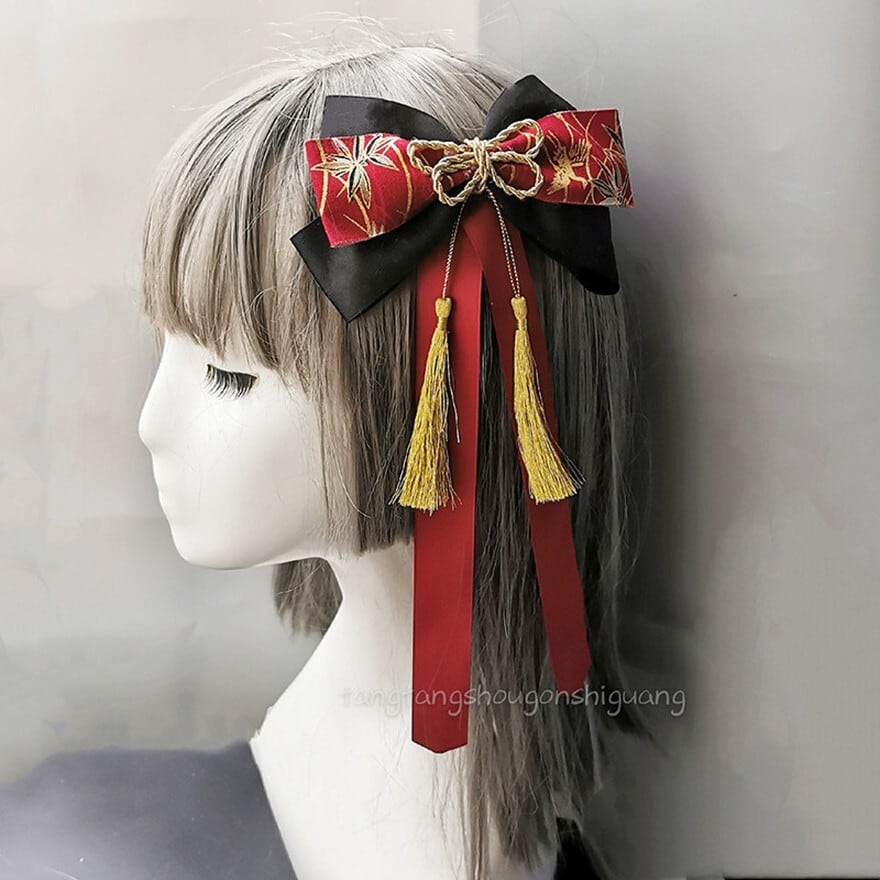 和風刺繍生地のリボンに金色の房飾りを組み合わせた、ロリィタファッション向けヘアアクセサリーです。左右対称の重ねリボン構造と垂れ下がる房が、後ろ姿に立体感と動きを与えます。甘さを抑えた配色で、和ロリやクラシカルロリィタのコーディネートに自然に馴染むデザインです。