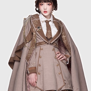 クラシカルな軍装モチーフを取り入れた、士官風デザインのロリィタジャンパースカート。フロントに配されたダブルボタンと、構築的なウエストラインが特徴です。無地調の落ち着いた配色で、甘さを抑えつつロリィタらしい立体感を表現。ブラウスや小物次第で印象を変えやすく、クラシカルロリィタを軸に幅広いコーディネートに対応します。