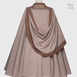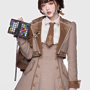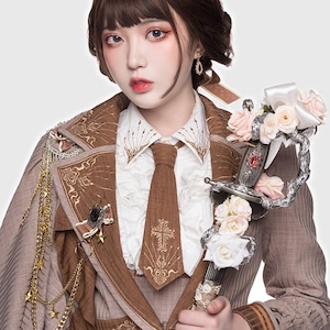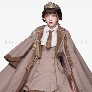 クラシカルな軍装意匠をロリィタファッションに落とし込んだフルセット構成の商品です。JSK、ブラウス、ジャケット、肩章ケープ、マント、ヘッドドレス、刺繍ネクタイを組み合わせ、刺繍装飾とレイヤードによる立体的なシルエットを形成します。色味は落ち着いたブラウン系を基調とし、甘さを抑えた端正な印象が特徴です。