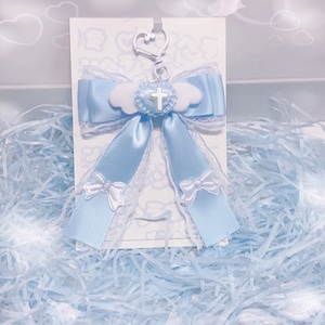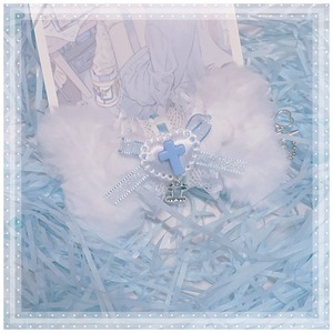 透き通るブルーリボンと翼モチーフが組み合わさり、コーディネートに“天使感”を添えるヘアアクセサリーです。