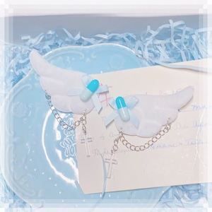 淡いブルーのリボンに、小さな天使の翼を添えたヘアアクセサリー。