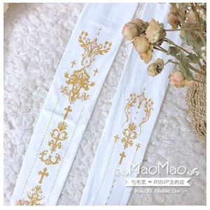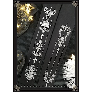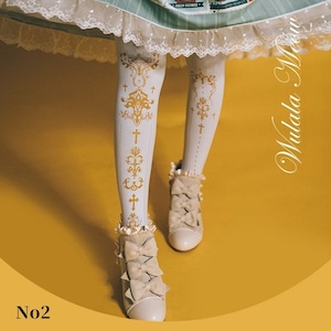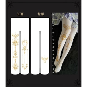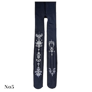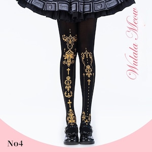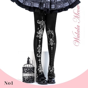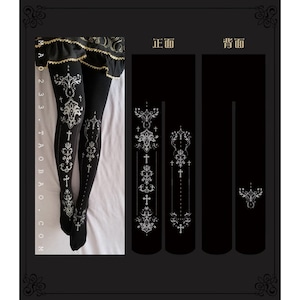 クラシカルなクロスモチーフと装飾紋章を縦に配置した、ゴシックロリィタ向けデザインタイツ。