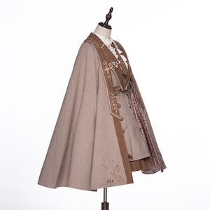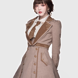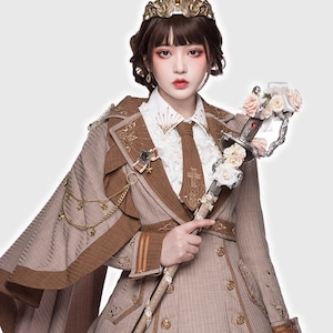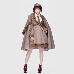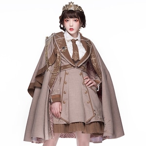 クラシカルな軍装デザインを基調に、刺繍入りラペルとダブルボタン仕様を組み合わせたロリィタ向けショートジャケットです。ウエスト切替と縦ラインを強調する構造により、上半身をすっきりと見せつつスカートとの相性を考慮した丈感に設計されています。同シリーズのボトムスと合わせたセットアップ着用にも対応し、クラロリを軸に落ち着いた世界観を演出します。