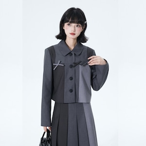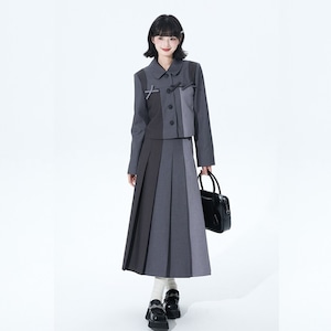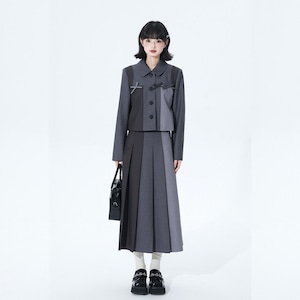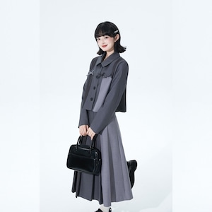 落ち着いたグレートーンの配色ジャケットと、縦ラインを強調するプリーツロングスカートを組み合わせたセットアップ。甘さを抑えたクラシカルな印象で、ロリィタの世界観を保ちつつ式典にも対応する構成です。装飾は控えめで、卒業式・入学式・きちんと感が求められる場にも違和感なく着用できます。