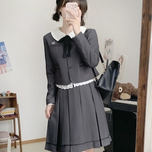 白襟ジャケット、リボン付きブラウス、プリーツスカートを組み合わせたクラシカル制服風ロリィタ3点セット。落ち着いた配色と直線的なシルエットが確認でき、甘さを抑えた印象です。式典にも対応しやすい上品なデザインが特徴です。