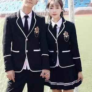 ・パイピング入りブレザーとエンブレム風装飾でクラシカルな制服調デザイン