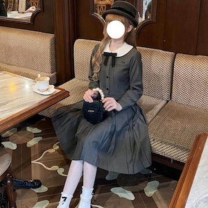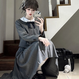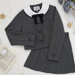 丸襟とリボンが印象的なクラシカルデザインのロリィタ上下セットです。長袖ジャケットと58cm丈プリーツスカートで構成され、落ち着いた色味と合身シルエットが特徴。甘さを抑えた端正な佇まいのため、卒業式や入学式など改まった場にも対応します。ロリィタ要素を残しつつ実用性も意識した一着です。