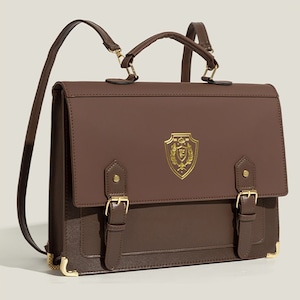 新入学や学院風コーデに自然になじむ、エンブレム付き2WAYスクールバッグです。箱型の端正なフォルムに、フラップとバックル金具を備えたクラシカルなデザインが特徴。手持ちと背負いの2WAY仕様で、ロリィタファッションに実用性ときちんと感を加えます。A4相当サイズに近い横幅があり、日常使いにも配慮された設計です。
