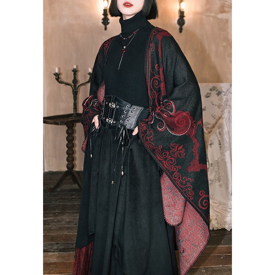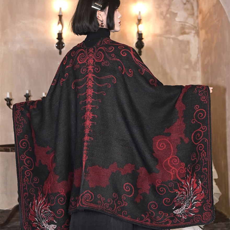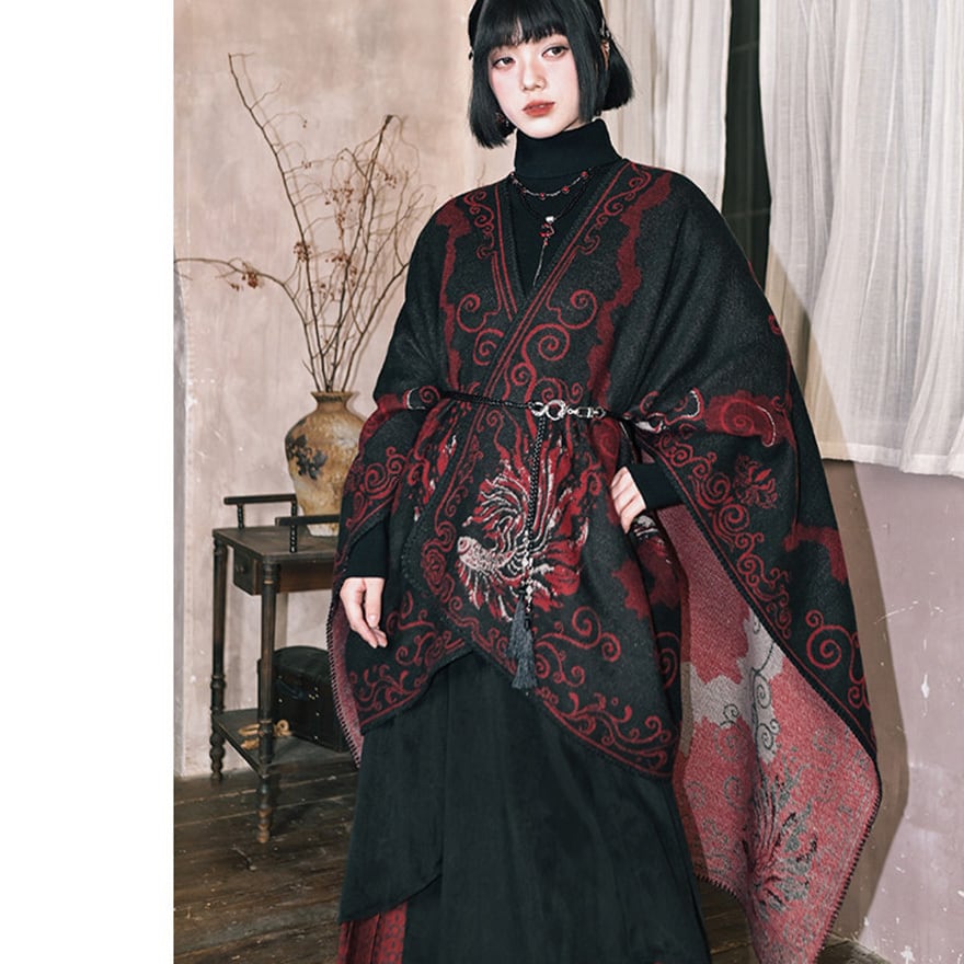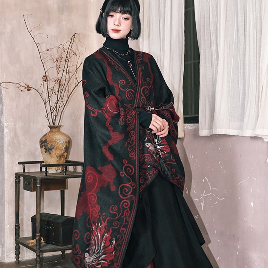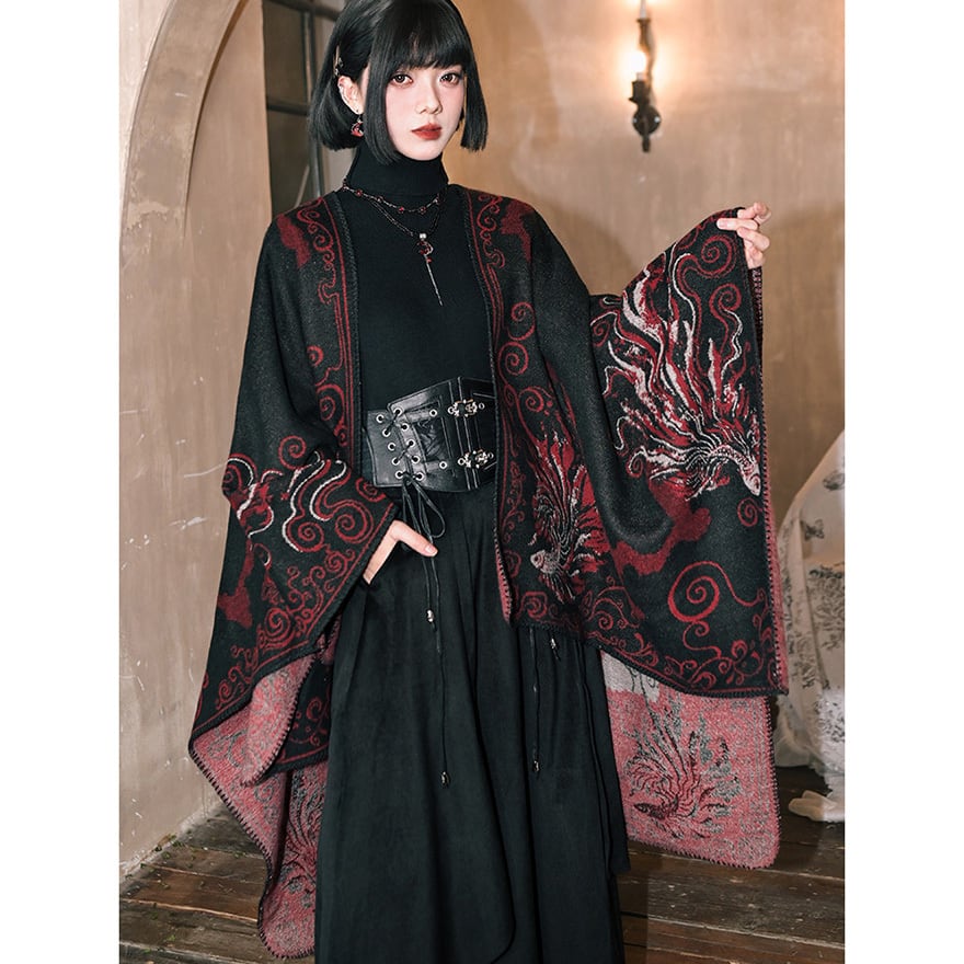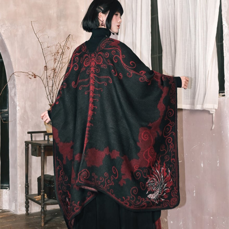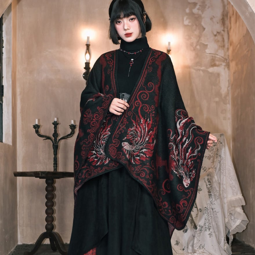 背面の背骨を思わせるシンメトリーな装飾や、裾に向かって広がる優雅な金魚の尾びれが特徴。厚手の素材感で、ダークな世界観を演出しつつ防寒性も兼ね備えます。